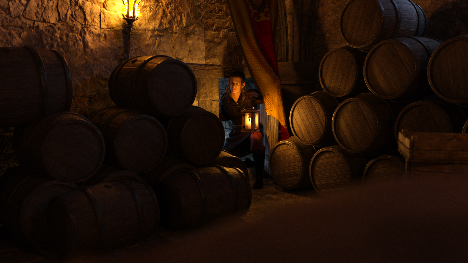Below is an image of the full environment for the lower level of the castle which contains the storerooms, holding cells, a large, vaulted room that serves as the guard barracks and then stairways up the next level.