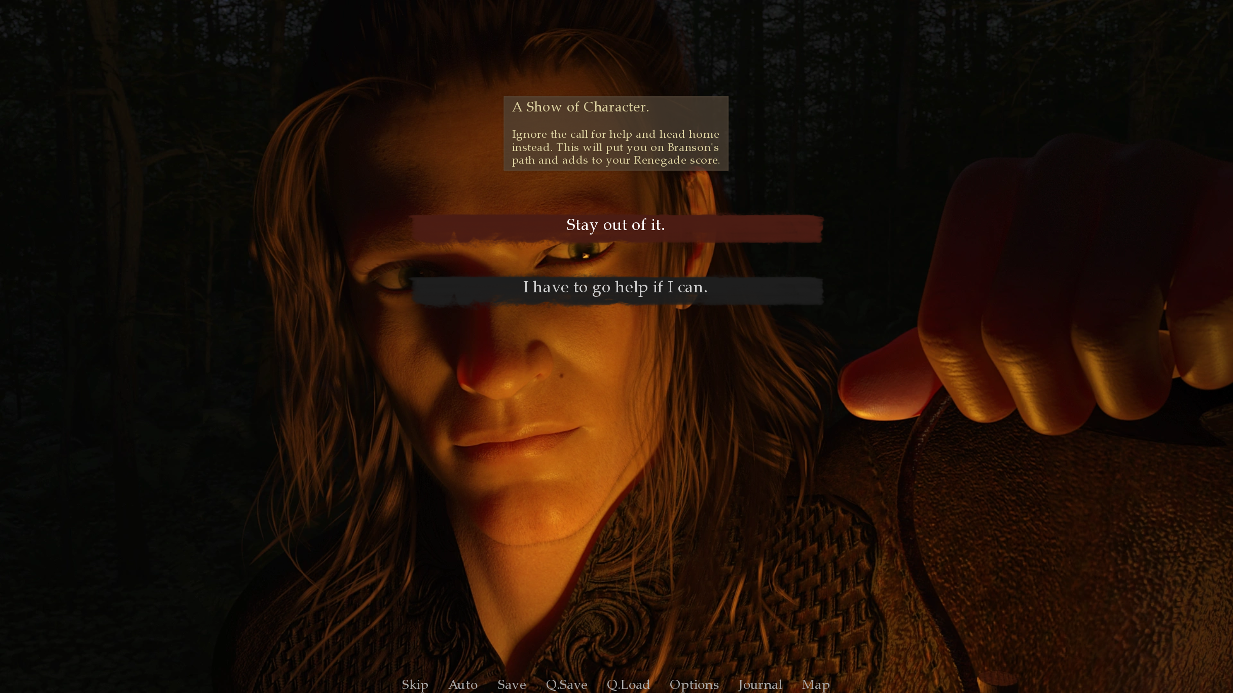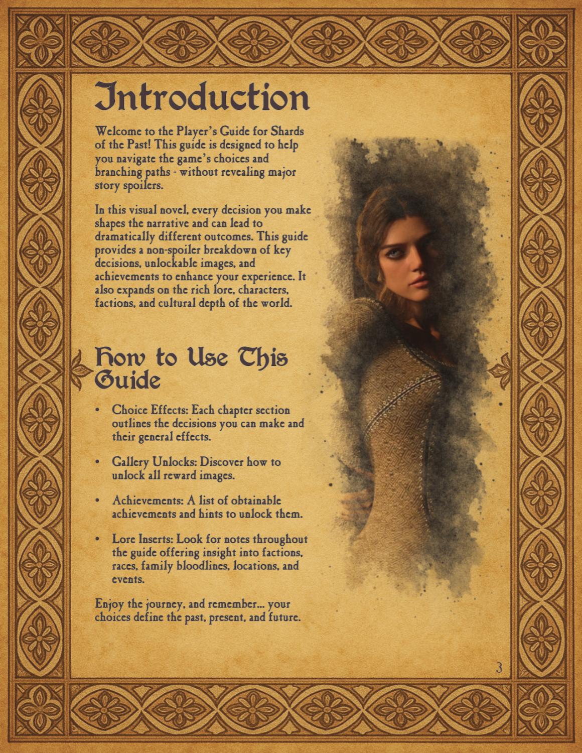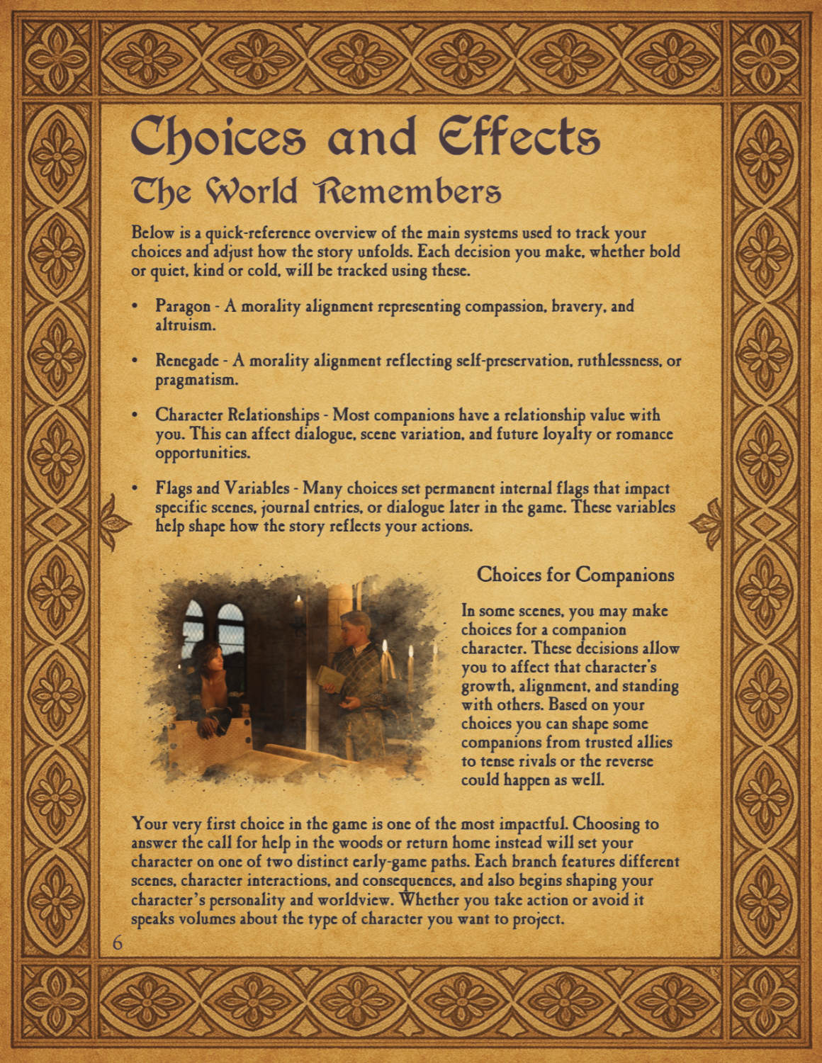 A Walkthrough Addon for the game is something I have been working on in between batches of image processing. This walkthrough can be used in two different ways. You can toggle an options in the menu to enable hints during your choices that appear in game. When these are turned on, when a choice appears if you hover over it with your mouse or tab between the choices, a pop up will appear. This popup has information about the choices and its effects. I try and keep the information as spoiler free as possible and use it more like hints to help you decide. Hints will tell you if a choice will improve or decrease your relationship with characters and other options, but I try and avoid using specific variable names and the numerical amounts. The other part of this addon are a PDF guidebook or player's guide that can be used as a companion to the game. This includes details on the choices you will face with hints like those in game, but with more detail. It also includes character backgrounds, world history and lore as well as art. Included I also added a gallery with many of the images from previously released special render series.