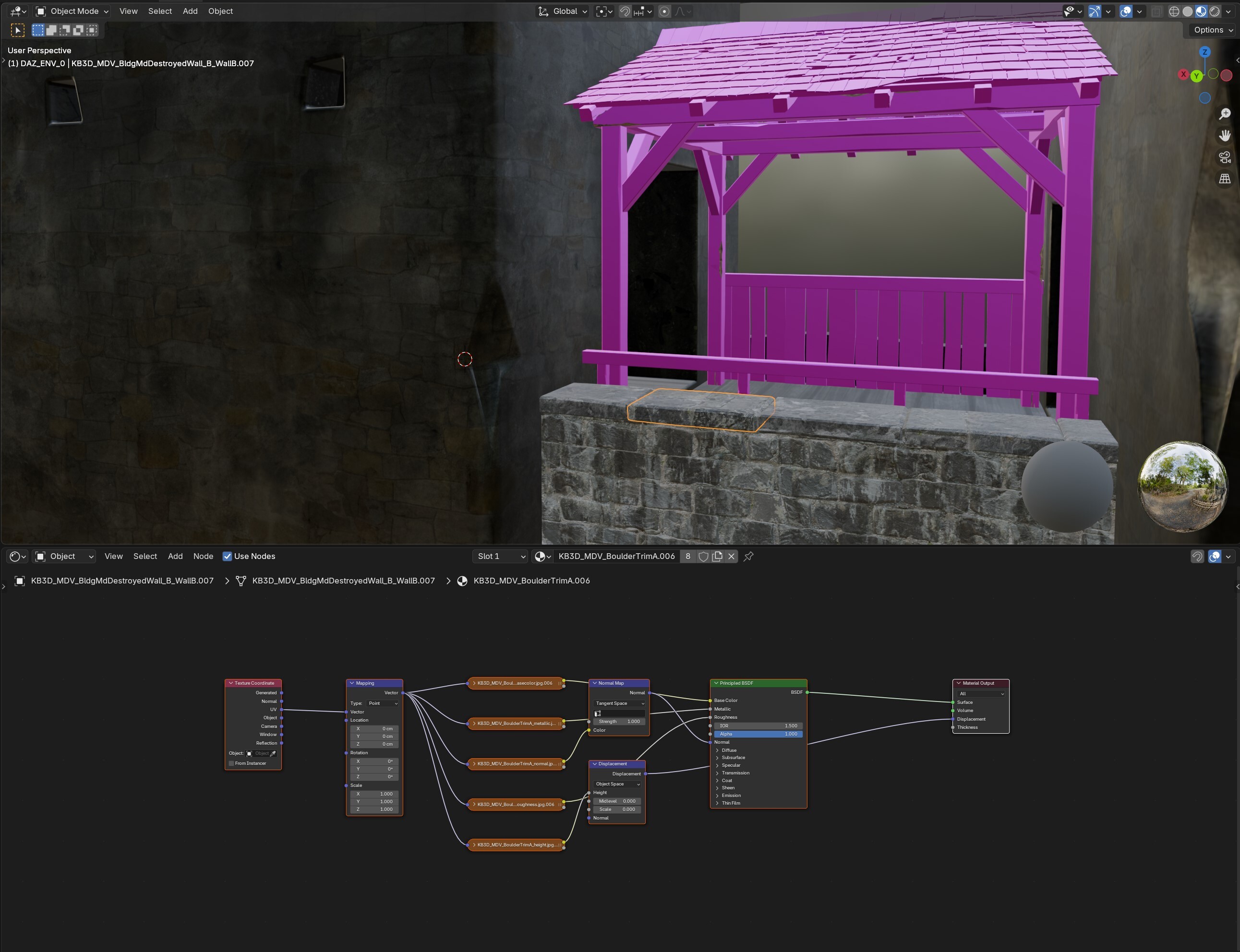 There is a choice in this upcoming release for version 0.4.0 that will split the story and put it on two of the most different paths experienced in the game so far. For one of these paths there is the need for many scenes in and around Castle Helmsworth. The current castle 3D asset is an older one and while it looks good in distance shots, once you get up close you start to really notice many imperfections. The scenes needed for the upcoming release will require many close up shots and for that the low level of detail on some of the castle assets would really stick out against the higher detailed models in the same scene. I have been trying to learn the Blender software for use in creating and editing assets so I have been slowly working on a rework for the Helmsworth castle. It is a 1 for 1 remake so it will be the same shape and dimensions as the current castle so that when I am finished with it I can drop it in place of the existing model in the environment. Going forward this will help improve the scenes and visuals for the Castle storylines, but also will allow me to update a few of the older renders will the new model if needed and to do so quickly with a simple replace and render. The below image shows some work as I replayed the geometry and materials for sections of walls, railings and roofs against the older current models lower detailed tower assets. While this work is taking a back seat to finishing up the current development cycle, it has given me some new skills in blender to use in some of the future environments that I am excited to try.