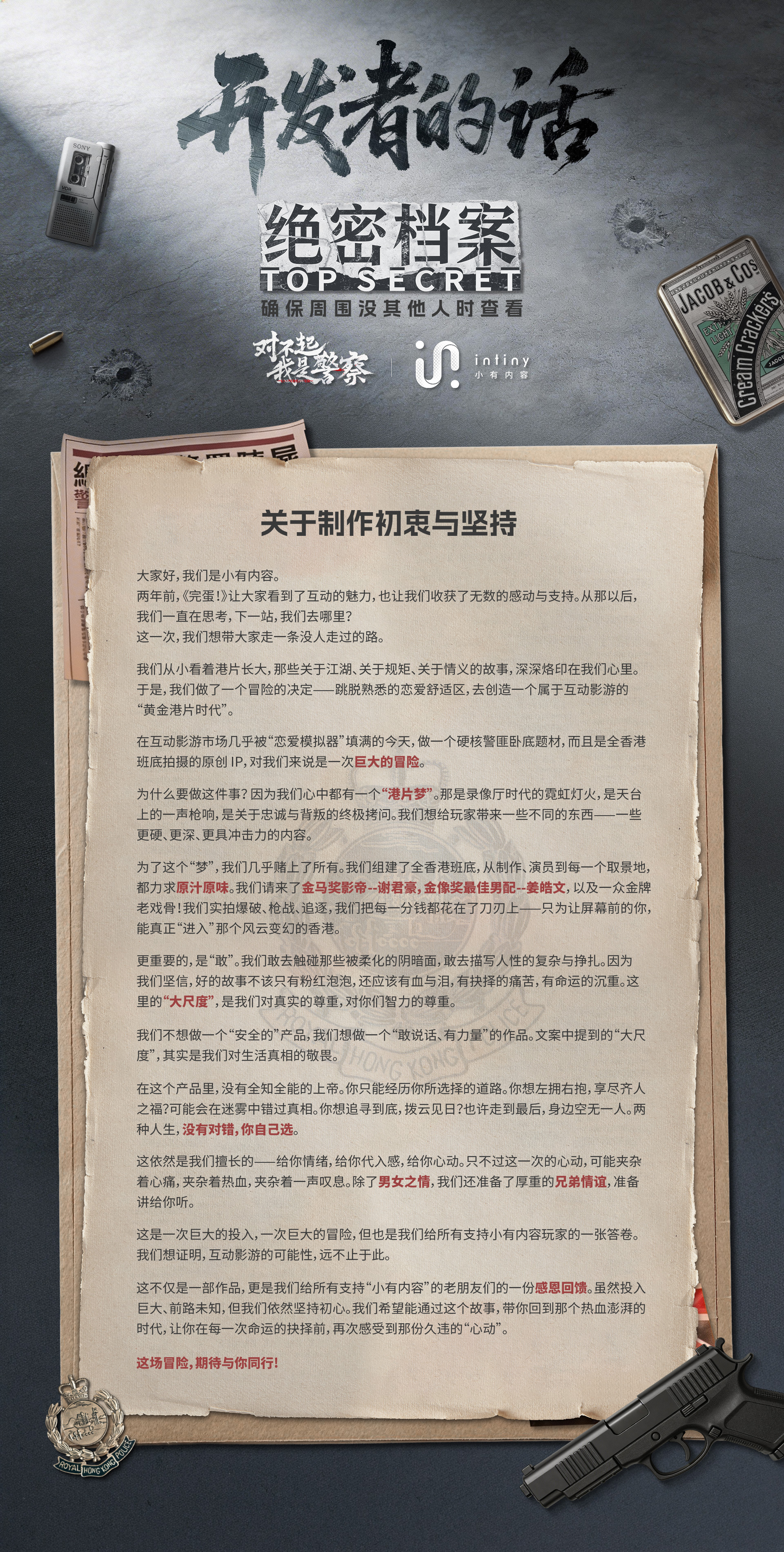 今日,由小有内容(intiny)团队倾力打造的全新真人互动影像作品——《对不起,我是警察》正式发布首支概念预告,并同步开启全平台预约。作为继现象级作品《完蛋!我被美女包围了!》之后的又一力作,小有内容此次带来硬核警匪题材,力求为玩家带来一场真正“敢拍、敢演、敢呈现”的沉浸式“港片”体验。