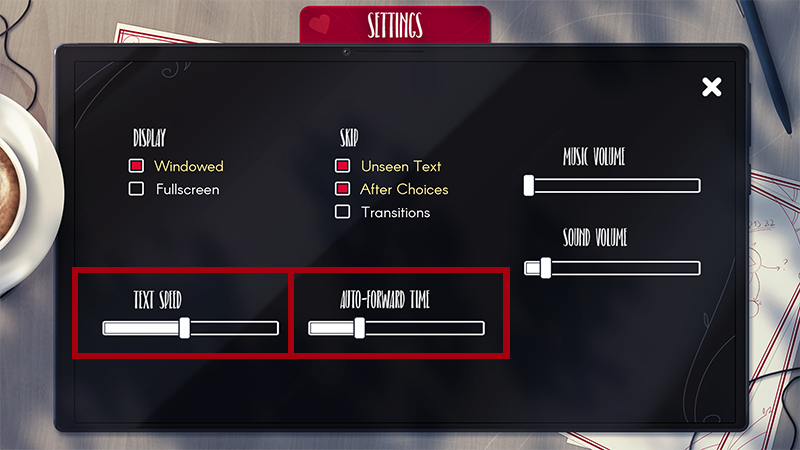 The settings for the text appearance and how fast it moves to the next dialogue screen can be adjusted via the following options in the games settings.