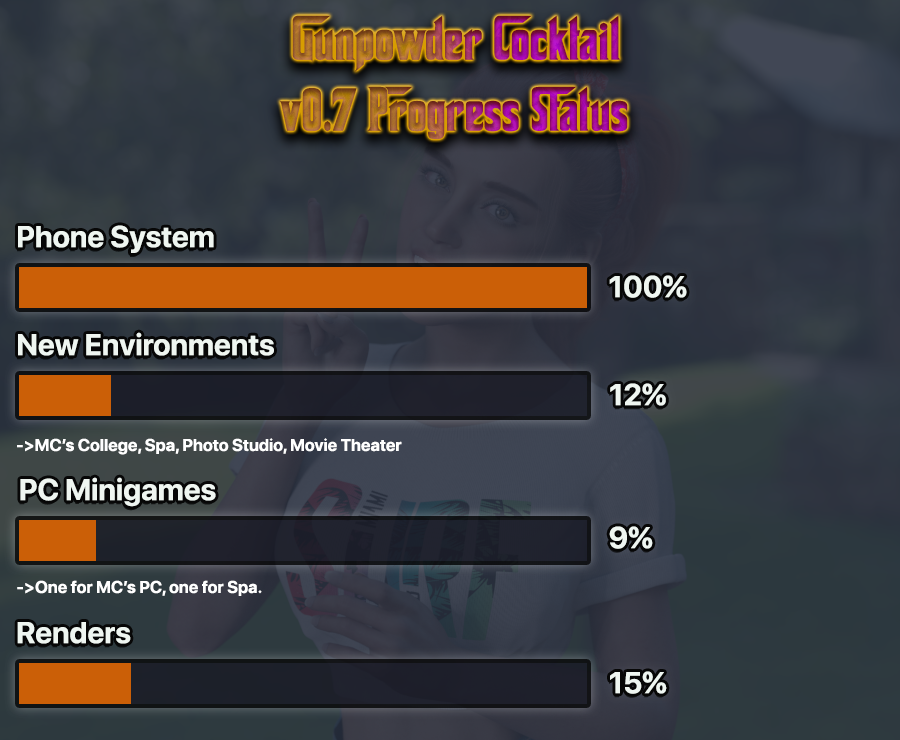 As for progress, I have some extra work to do in this update. Not only the renders and the script, I also have a few new features, new locations and mini-games to add.