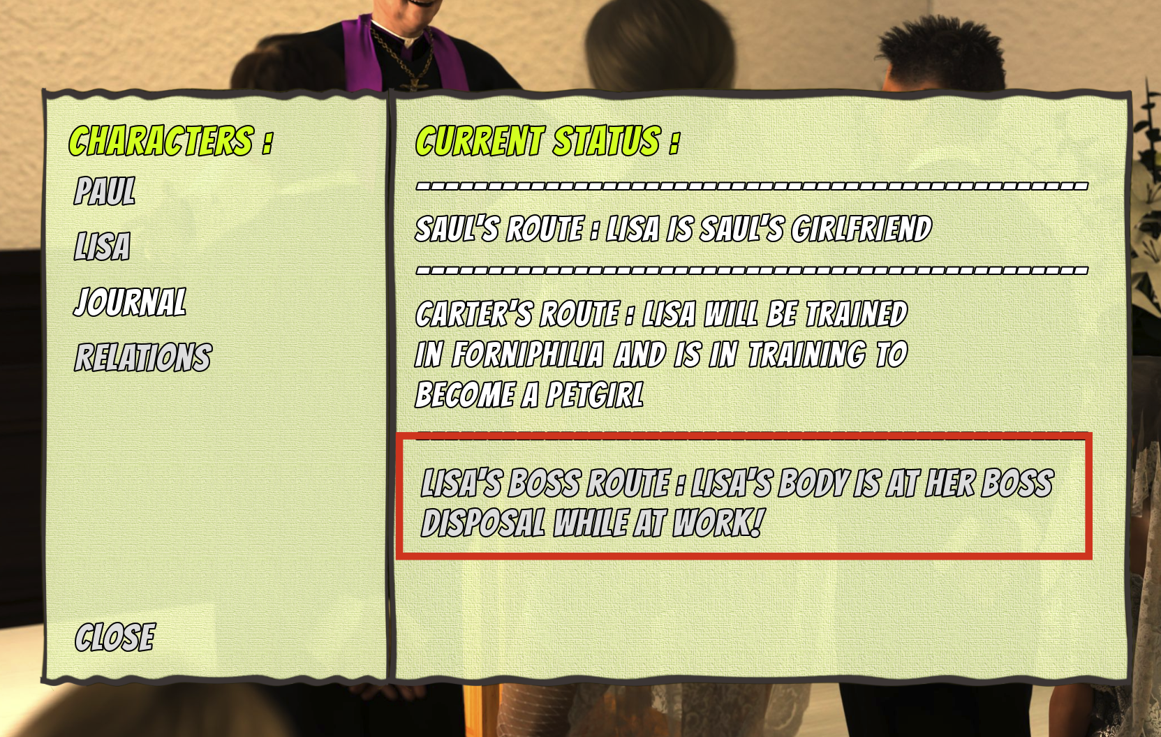 • When she returns home, you should see the MC and Gipsy together, and Lisa catches them.