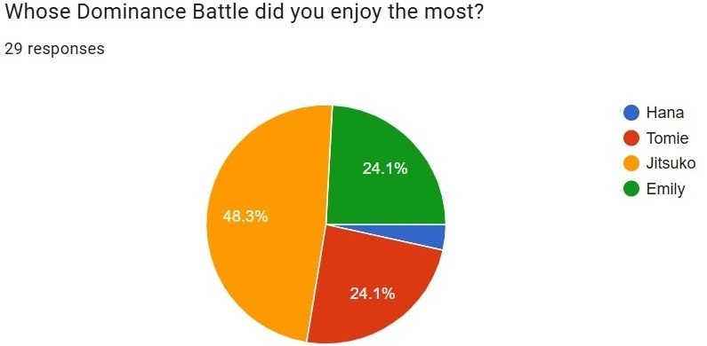 Quick update: these screenshots were taken 3 days ago, after no new reviews came in for almost a week. After already writing this post, Jitsuko climbed back up to 51.6% on the Dominance Battles poll.