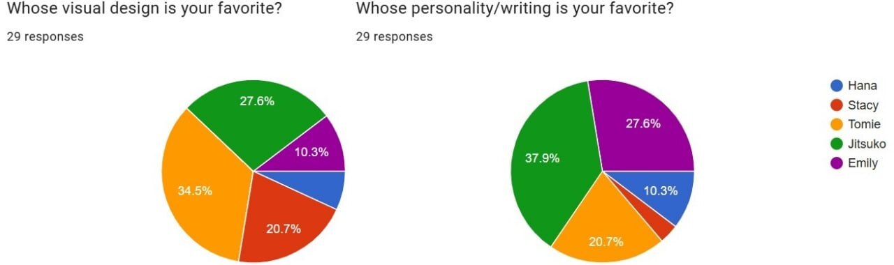 Let's start with the character polls. These were very surprising to us. We've done polls in the past to see which character people were most interested in and wanted to see more of. In those polls, Jitsuko was always last. Dead last. Not even in the running last. I genuinely mean: "She only got 2 votes and one of those was me" last. It's crazy to us that she's scoring so high on all 3 character polls.
