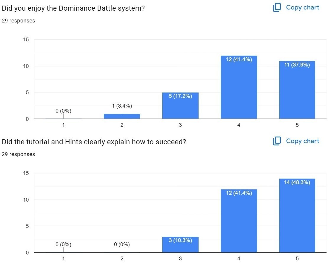 The vast majority really liked our combat system and it's great to see all the effort that went into designing, testing and tweaking it paid off. This is also largely thanks to our own testers who helped give an outside perspective on what the balance was like for players who don't know the mechanics inside and out like we do. With their help, we reworded parts of the tutorial and added the Hints screen, which seems to have paid off when we look at the feedback we've received here.