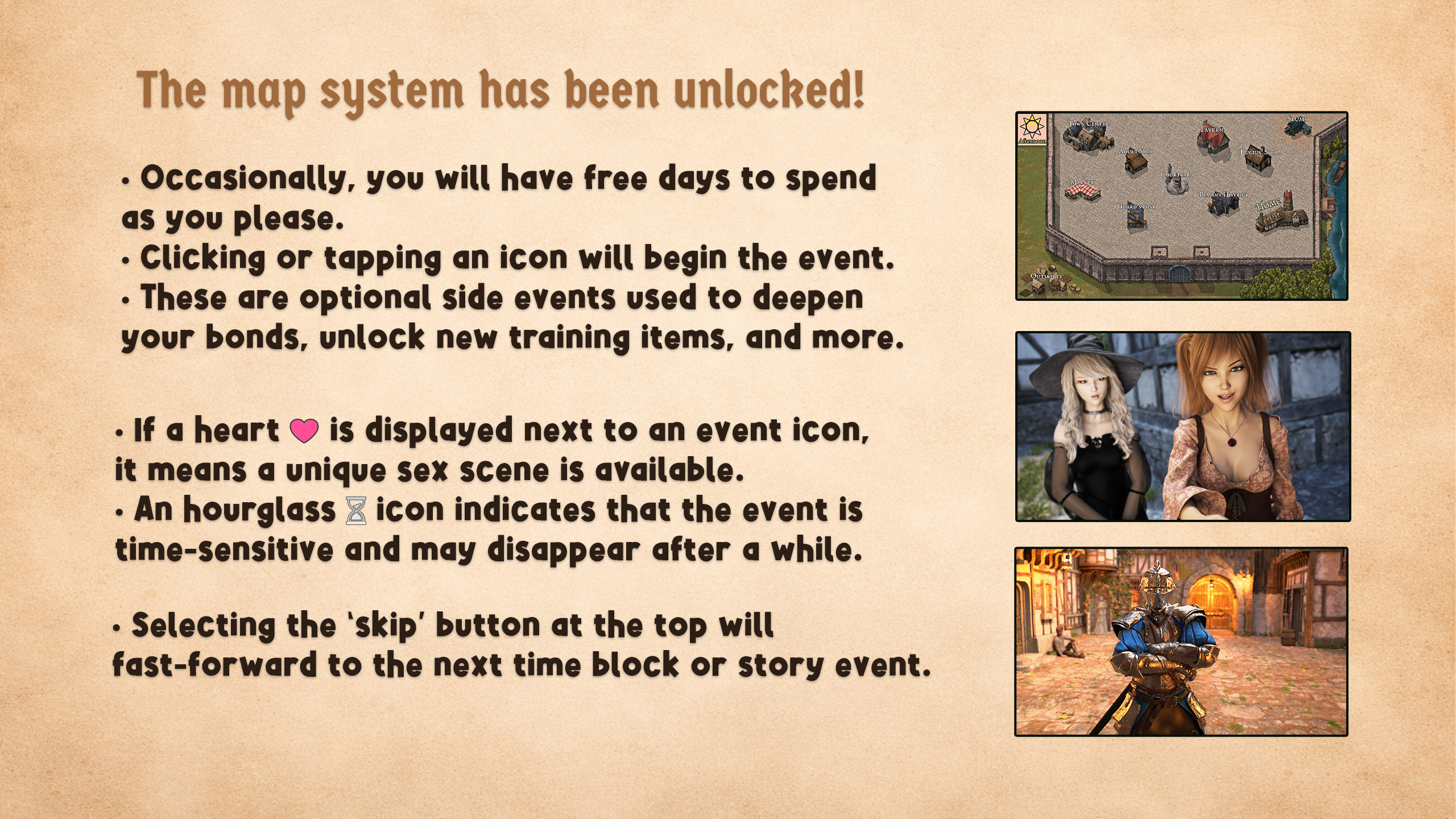 I've also expanded the scene with Ann & Ellania to now have hairstyle variations for Valerie. There's also new tutorial images for the training and map systems, which should be a big improvement over how it was before.