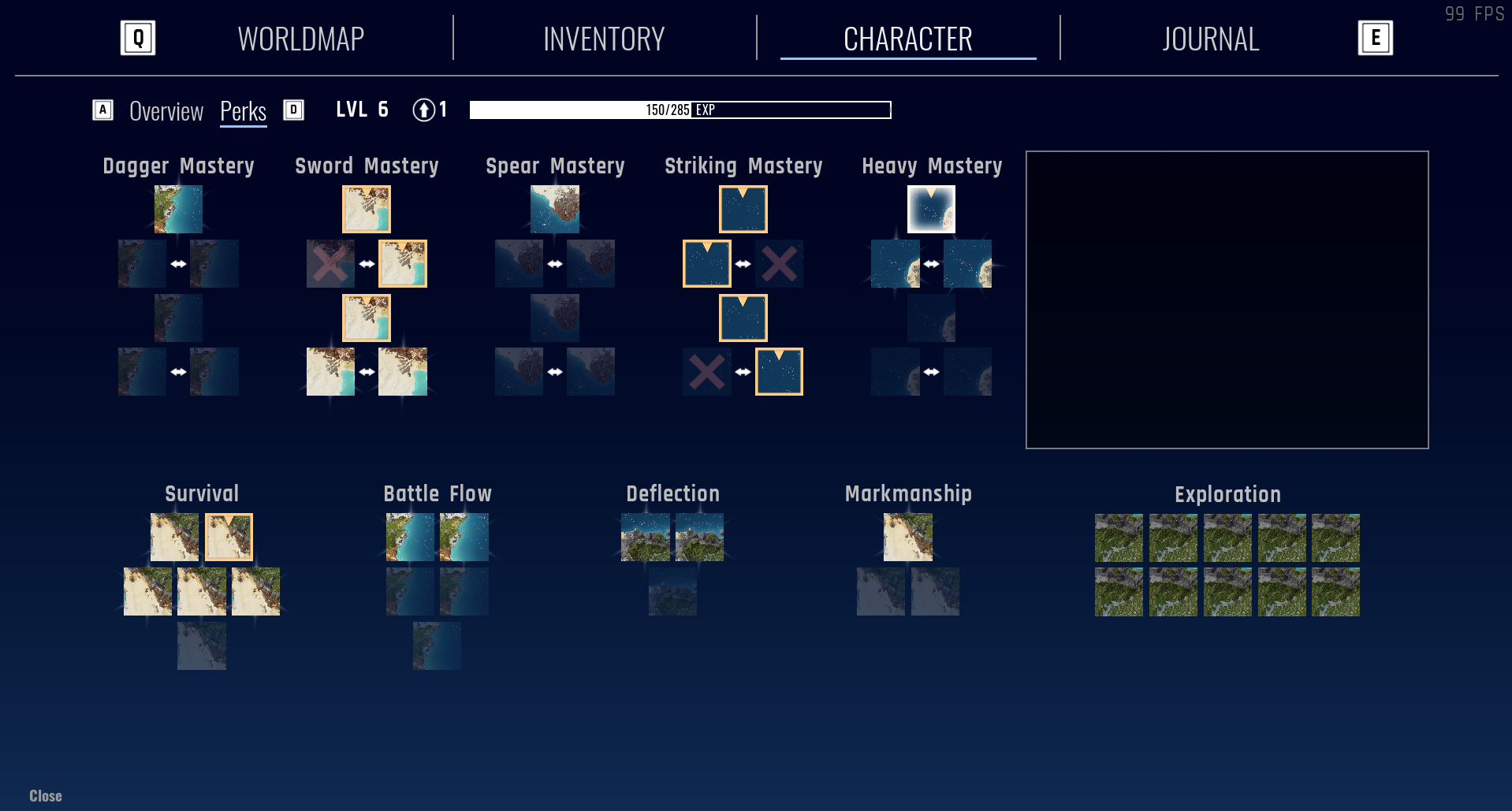 Lastly, a new set of character screens is in the works now: an overview tab for displaying current character stats as well as spending learning points on attributes and a perk tab for spending learning points on perks.