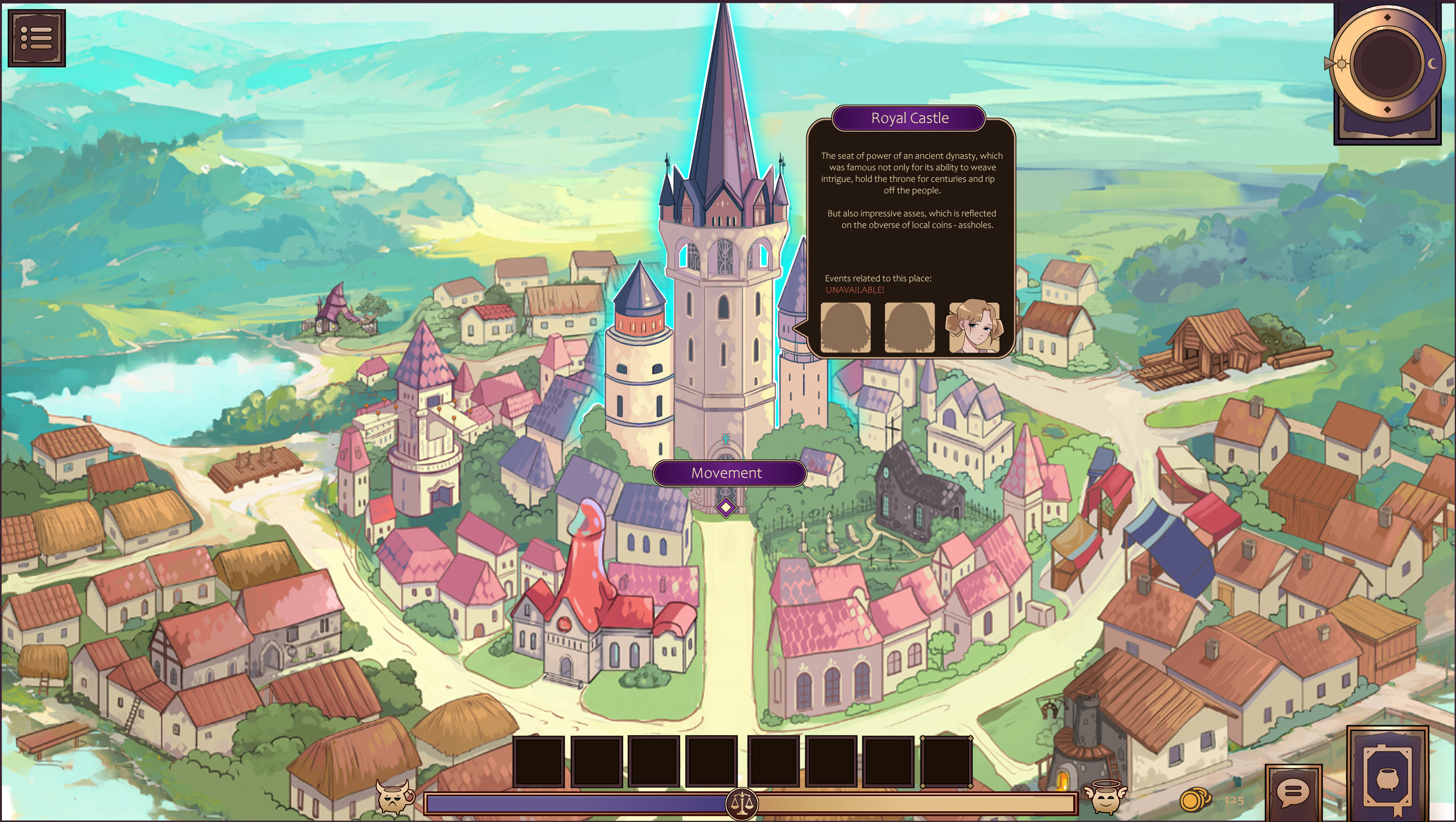 - - A city map with accessible movement between areas;