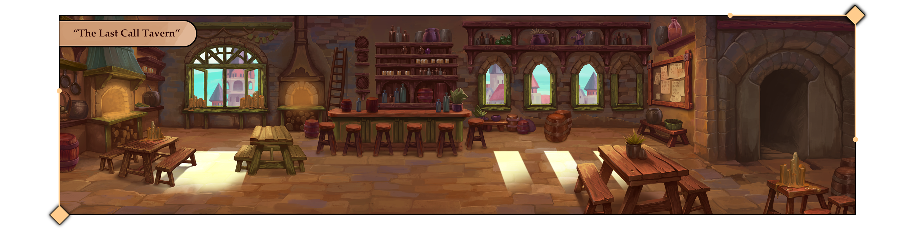 “The Last Call Tavern” –– where you can relax, hear gossip, and arm wrestle with the local tough guys.