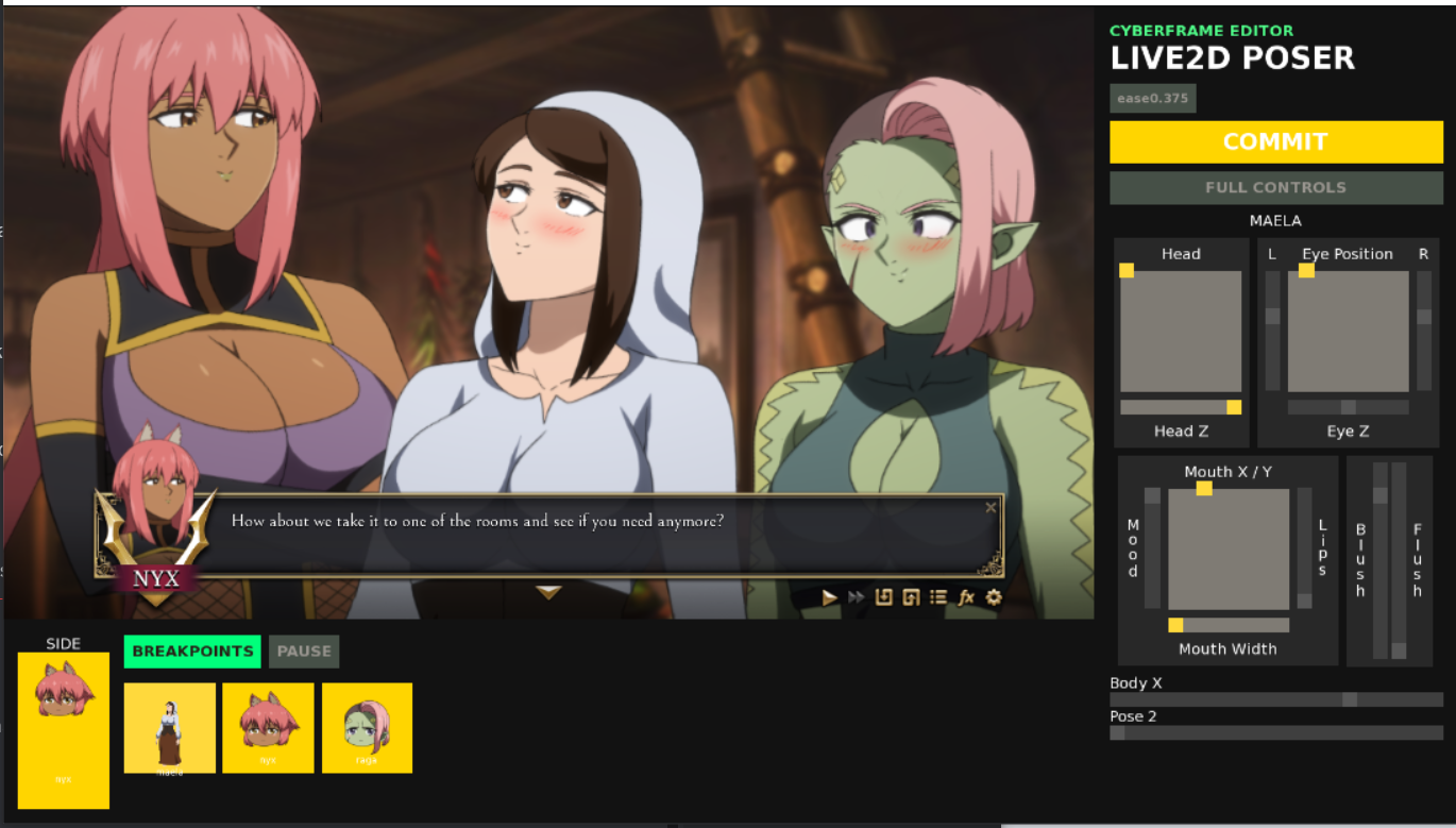 If we'd decided to go with the standard "one character on the left, one on the right" format of visual novels, we wouldn't have any of these problems... but we didn't. That's not what we wanted for Vaygren. From the beginning, we always wanted Vaygren LT to feel as much like watching an anime as possible, and to pull that off that means A LOT of custom code, custom tools, and figuring out how to work with the limited assets we have to pull off the look we want.