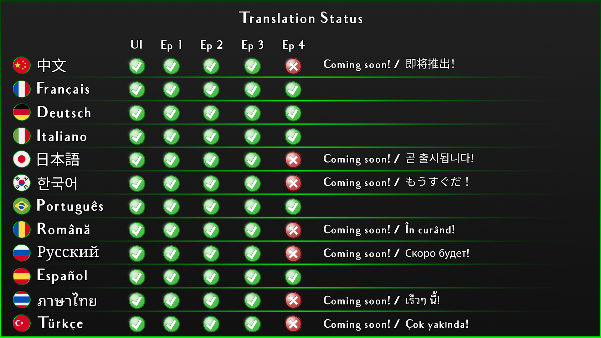 - Added translations (for episodes 1-3) for Japanese, Korean, Romanian and Turkish.