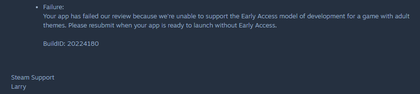 As you already know, I wanted to release Part 2 in Early Access around January when I finish Episode 11 of the game. Unfortunately, Steam has recently revised its rules, and adult games are no longer permitted to be released in Early Access. Here's what I got when I sent a build of the game for review: