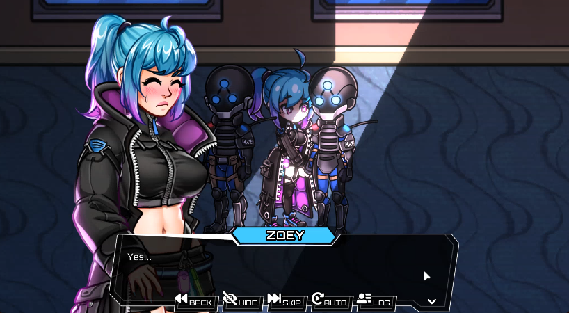 show Zoey's face (looking at viewer!), boobas and neck slot