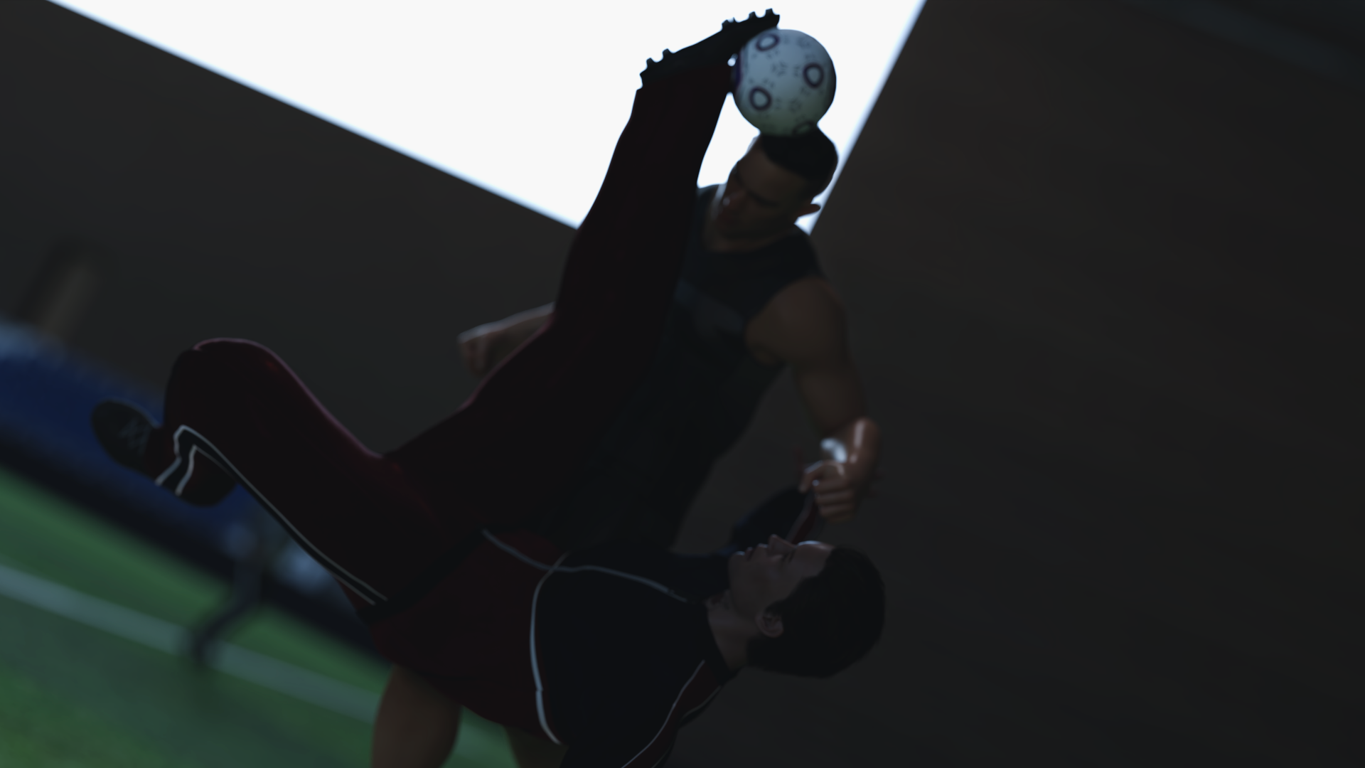 Fifth scene: This one was a bit strange. We couldn't find a good football field asset that fit our context, so we had to make one. So far we're pleased with how it turned out. As of today, we have 146 rendered and 170 posed and we're still working on it.