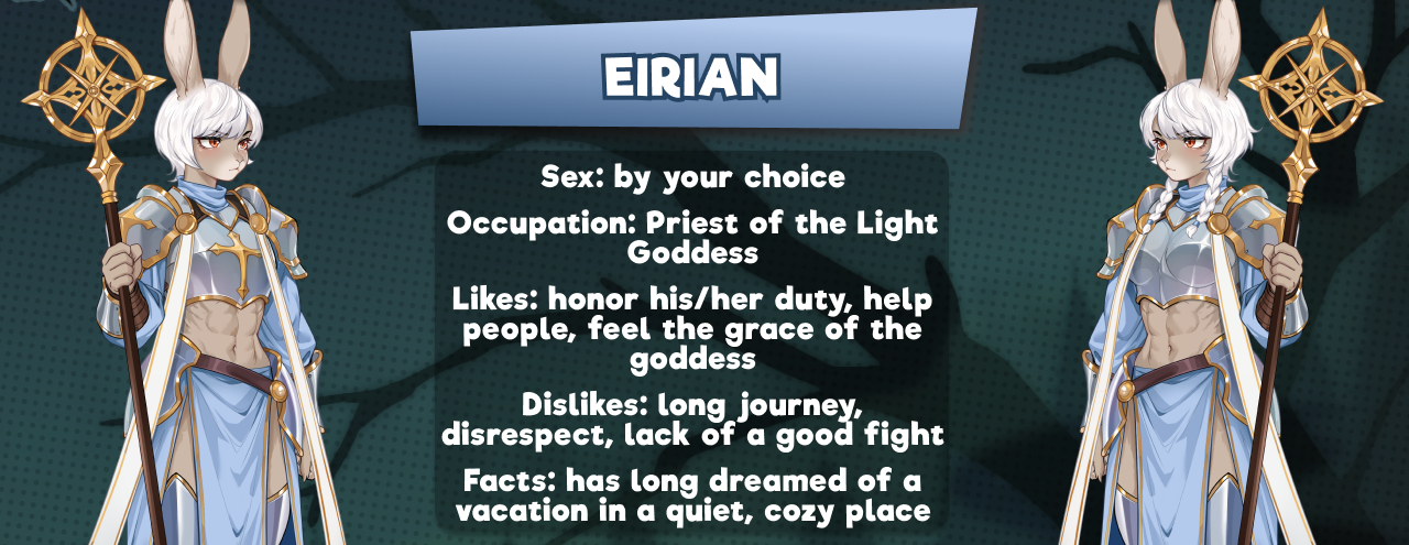 On his way to the village, Eirian honestly thought that this assignment would be of the following type: arrive, see that the drunk men had seen something strange, and leave. He/she had been thinking about vacation for a long time, and now he/she had been sent to a godforsaken village where there would be nothing interesting. That's what Eirian was thinking until he/she met a long-dead goat at the entrance, which waved greetings to the priest...