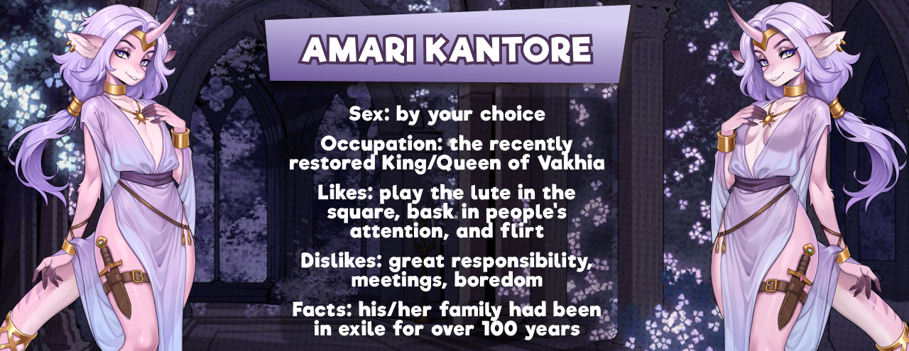 Story in story time: After a hundred years of exile, the royal family of Cantore regained the throne of Vakhia. The troops of the true ruler, Amari, were led by his/her loyal friend and advisor, Rowan Warden, known as the Poisonous Blade. The usurper was defeated, his relatives fled, hoping for a rebellion, but the people chose Amari. The Cantore were famous for their charming charisma: one glance and one voice from Amari was enough to make people freeze and kneel.
