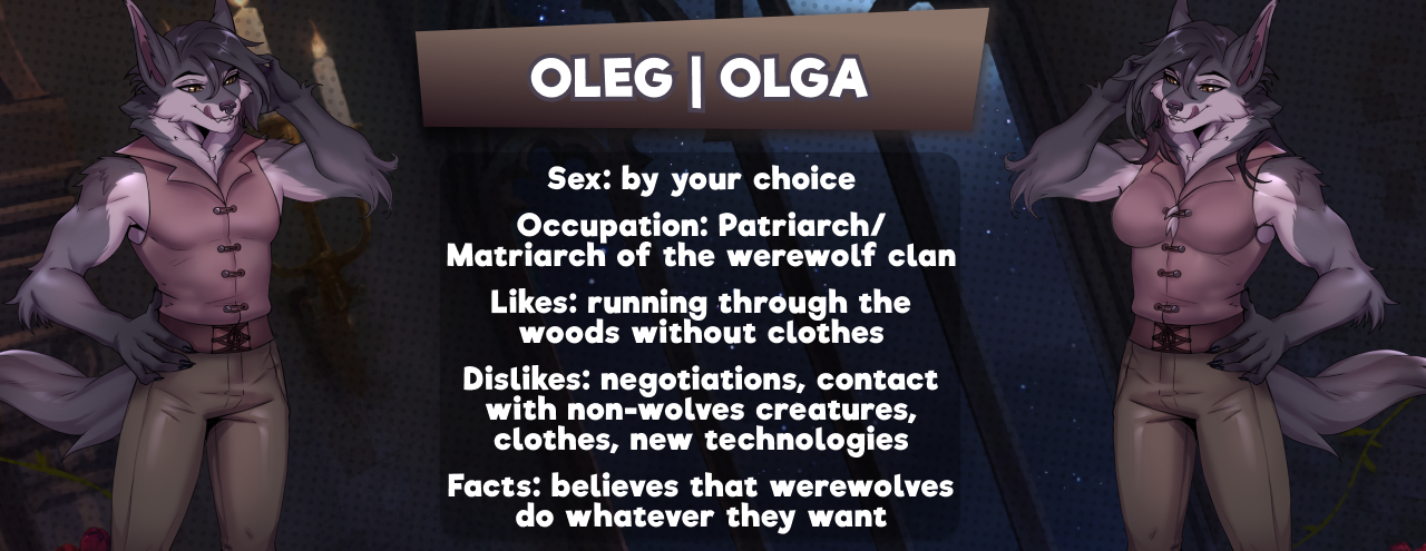 Not long ago, this fierce wolf became the head of the clan (although who knows how “recently” that was for werewolves). Despite his/her gender, Oleg/Olga remains a fierce and powerful representative of his/her species. The last point, well, let's say... It's a phrase he/she would say to a mischievous little vampire. Freedom reigns in the werewolves' home, including in terms of sexual traditions.
