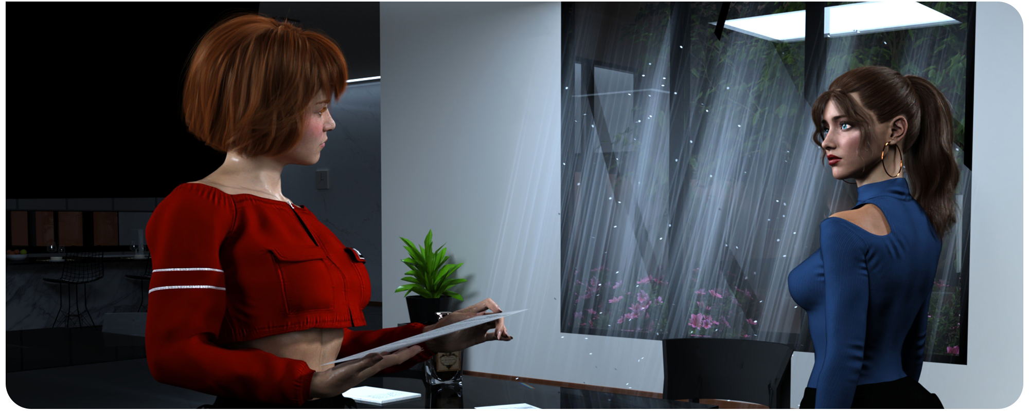 At the heart of "Our Home", Emily is the link that binds everything together: a loyal ally, a confidante, and, potentially, a deep love. Her bond with the protagonist is the core of the story, a childhood love rekindled, filled with nostalgia and promises. In scenes like the reunion, she says: "I've wanted to do this for a long time", a romantic teaser that sets pulses racing. With Lana, Emily is an unwavering support, helping in moments of crisis, such as in the kitchen or garden, always with lines like: "We're in this together."