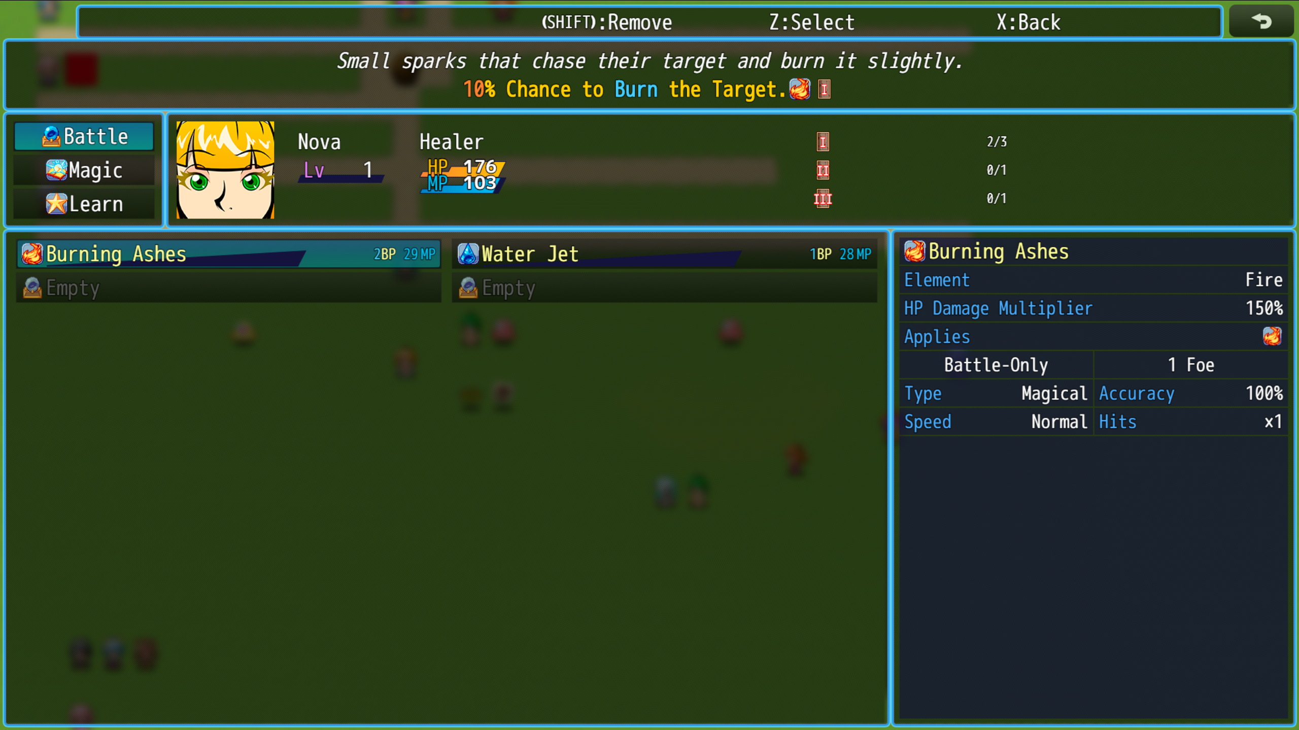 ✦ A system has been added to Equip Skills before combat. (This was done to avoid cluttering the combat screen and having endless lists of skills to select from.)