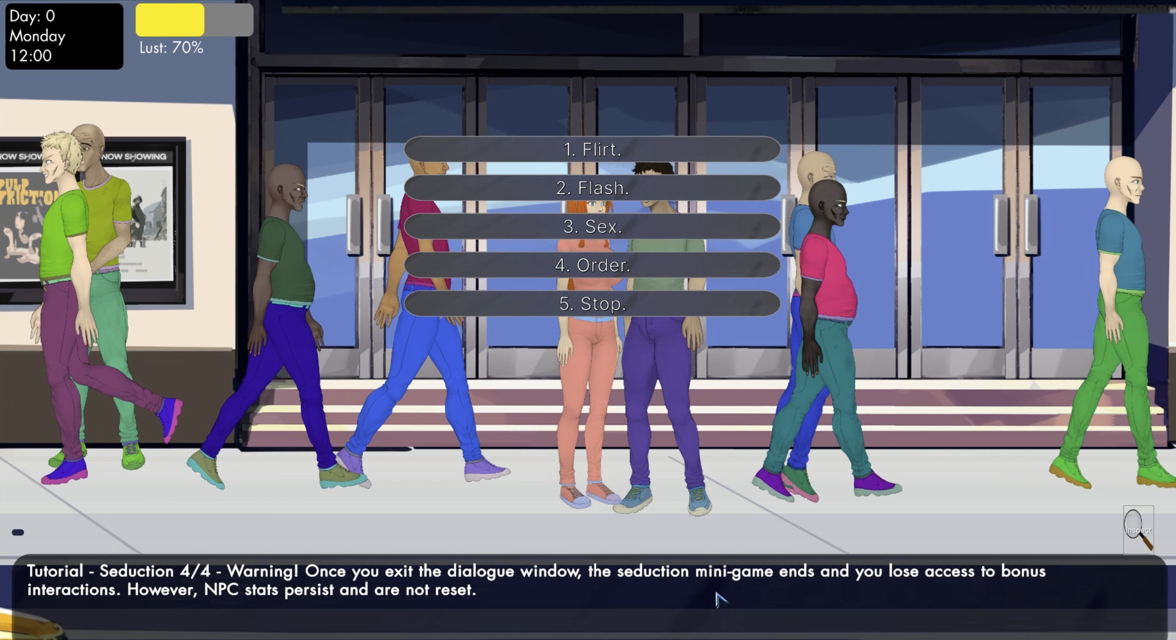 I've started working on the Seduction Mini-Game. For now, I’ve completed the initial design and logic, added chat bubbles based on actions, and implemented small details like NPCs temporarily stopping or returning to their responsibilities afterward. Anyway, since it’s not finished yet, I’ll keep it brief. Since this is an NSFW game, I want seduction to play a key role - similar to how Speech works in traditional RPGs. It should be usable in various scenes and accessible to most character builds (although characters with no sex knowledge or corruption won’t be able to use it). A lot of events, dialogues, mini-games, and pricing will be influenced by the NPCs’ Disposition stat. The goal of Seduction is to temporarily increase that stat. But since the game emphasizes meaningful choices, seduction won't be a no-brainer, so you can naturally fail or even overdo it. Failing a seduction attempt will lower the NPC’s Disposition and make them angry. Succeeding will give you what you want - a higher Disposition. However, overdoing it can make the NPC aroused, gropy, or more. I'm also planning some traits/perks to make "over-seducing" more rewarding for certain playstyles, or to allow flirting alone to accomplish goals, but more on that later. Mechanically, Seduction will work similarly to the Prostitution & Masturbation mini-games, where you have a limited number of actions to seduce the NPC. The effectiveness of each action will depend on both Jane’s and the NPC’s stats.