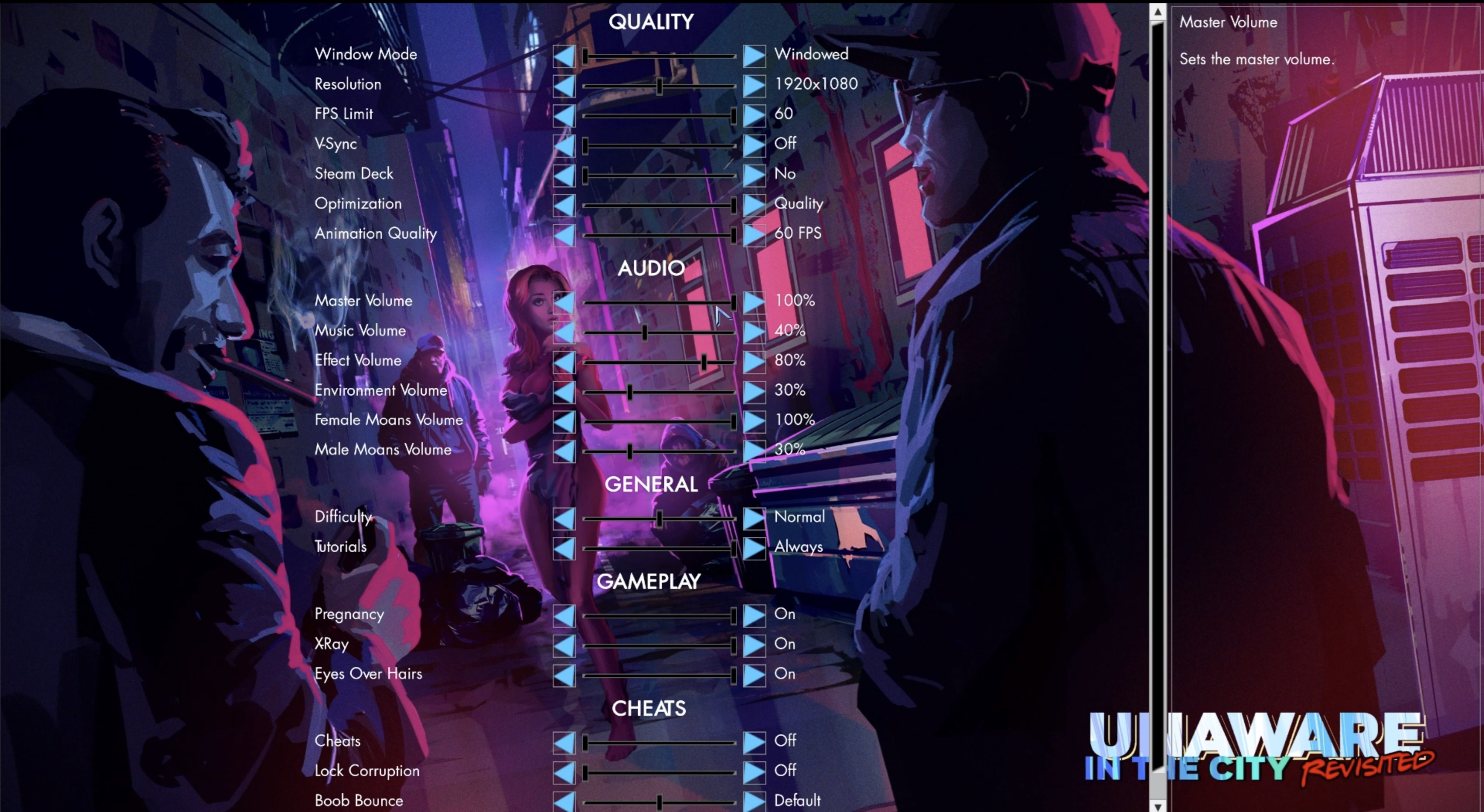 In the old UiTC, settings were bound to the player character, meaning they were inaccessible before the player was spawned (like from the main menu). Learning from my past mistakes, I'm now splitting settings into groups, like quality or audio, adding sliders everywhere, and using a dedicated text window instead of tooltips, which should work better on Android & Steam Deck. All game settings are already connected to their corresponding variables and functions, so things like volume, FPS limit, etc., are functional, but not all features are finished yet, like pregnancy. Yeah, I still need to work on the overall UI layout, but for now, I just want to get everything working. It's still a very early test and missing many settings, as it's far from finished.