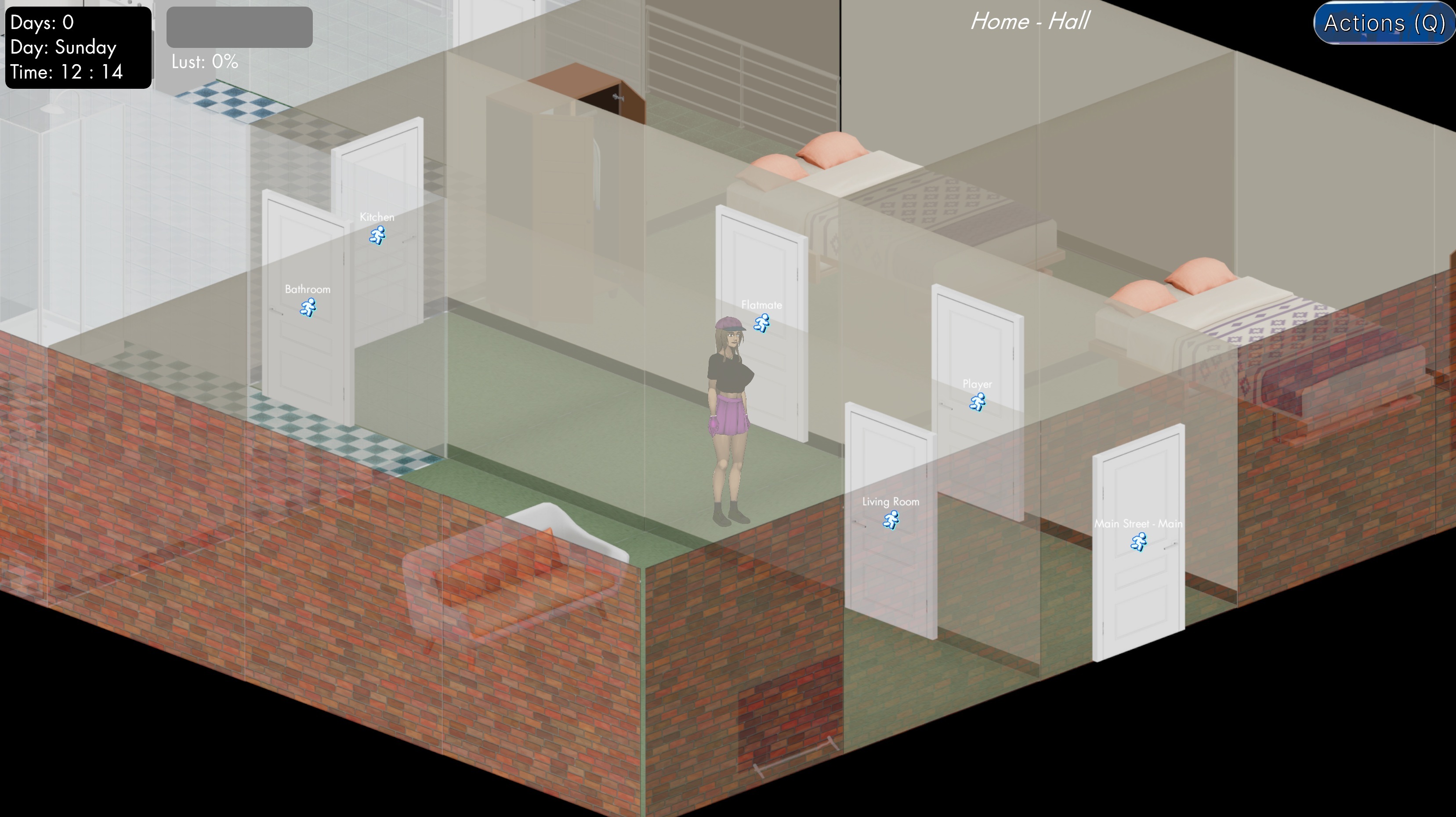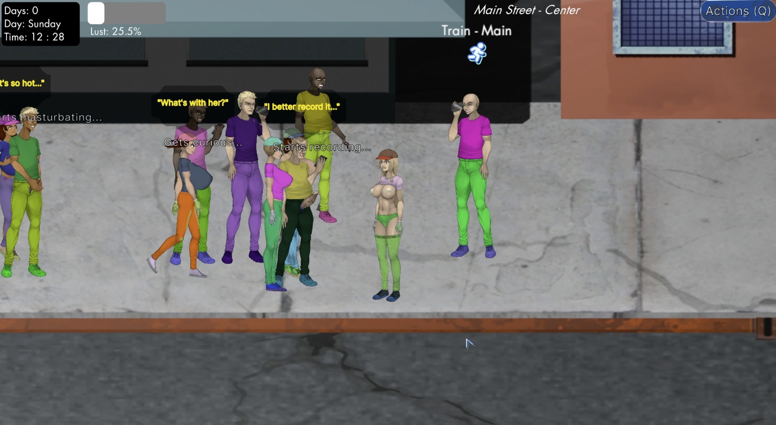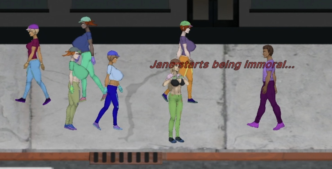 While Jane is in an Immoral State (flashing, masturbating, etc.) and visible to NPCs, they start building Lust. As their Lust rises, the chance of them acting sexually increases. The more exposed Jane is, and the higher her stats like Charm, the faster those meters fill. A high Charm also increases the odds of being groped when bumping into someone.