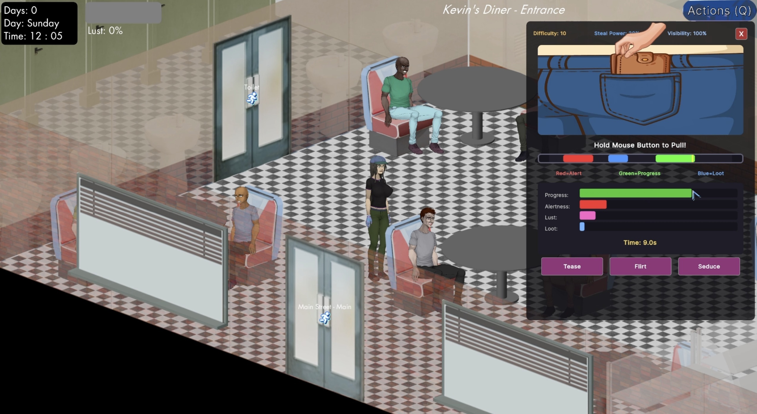 Some features are still in progress, such as NPC traits, a visible inventory window (so you don’t have to initiate trade to see what can be stolen), proper animations (Jane currently just moves behind her target), and the caught event. I don’t plan to dynamically change the mini-game visuals based on the NPC’s clothing, as that would waste my already limited resources. However, I’ll at least make the mini-game pants color match the NPC’s, and swap the male pocket art for a female bag when the NPC is a woman. All art shown is placeholder until I have a proper artist.