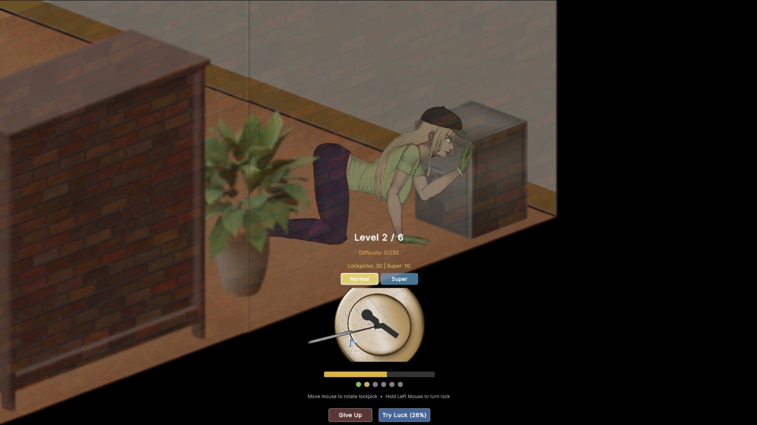 - Gameplay is simple - you hold the left mouse button for a short moment at the correct spot until the lock fully rotates. The more it rotates, the closer you are to the correct spot. If it stops rotating before that, the spot is wrong, and the lockpick will start taking damage until it breaks.