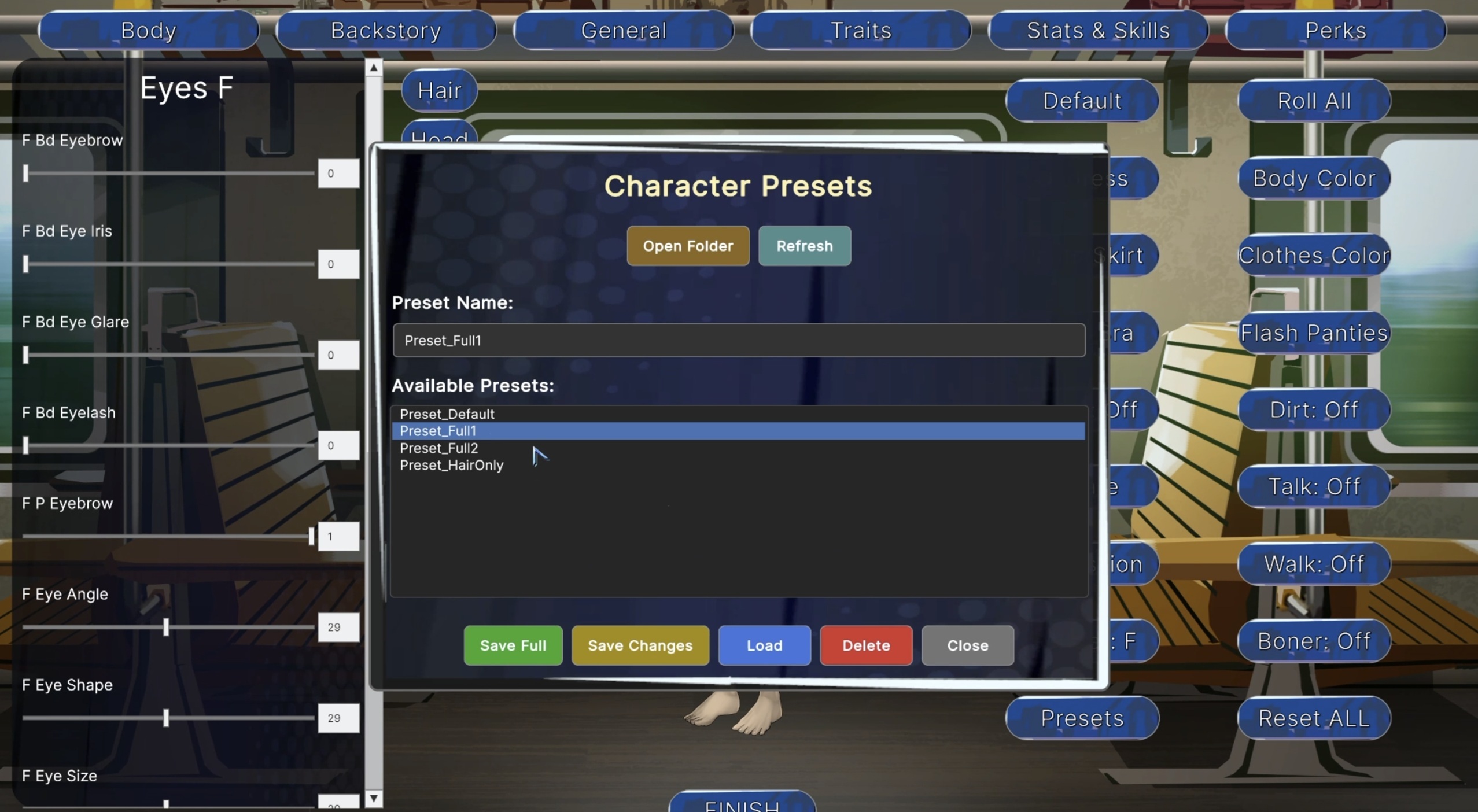The system saves all settings except for Difficulty, Pee, and Pregnancy options from the General tab, since those vary a lot from player to player. Everything else - body, backstory, general, trait, and perk settings - will be saved. You can also choose whether to save everything or only the things you’ve changed (for example, just the face or traits). It’s completely safe to manually edit the .txt file, so you can add new lines or delete existing ones without breaking anything.
