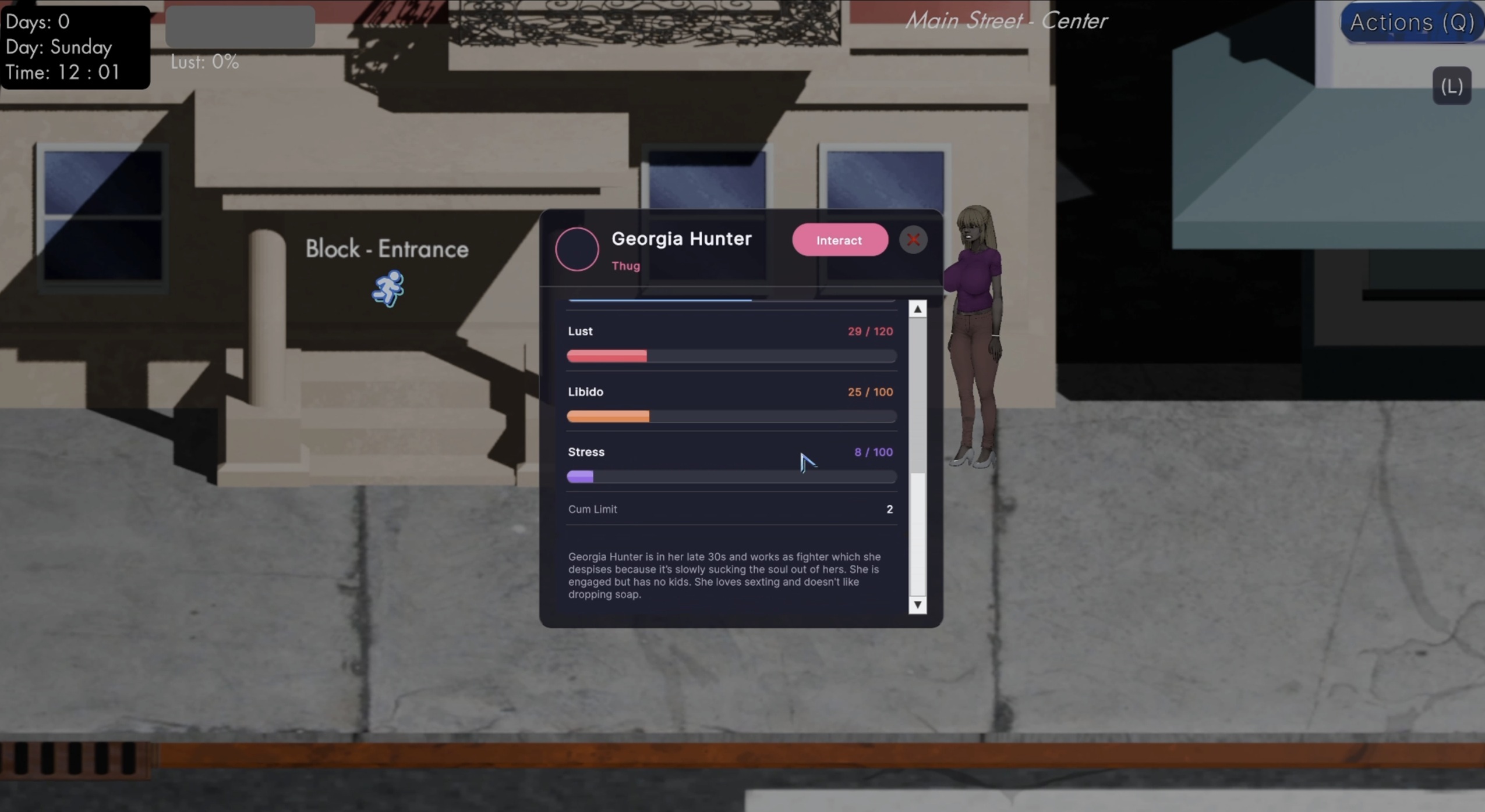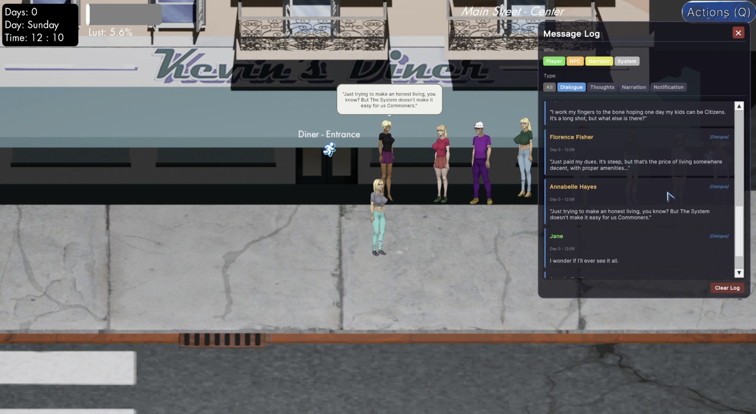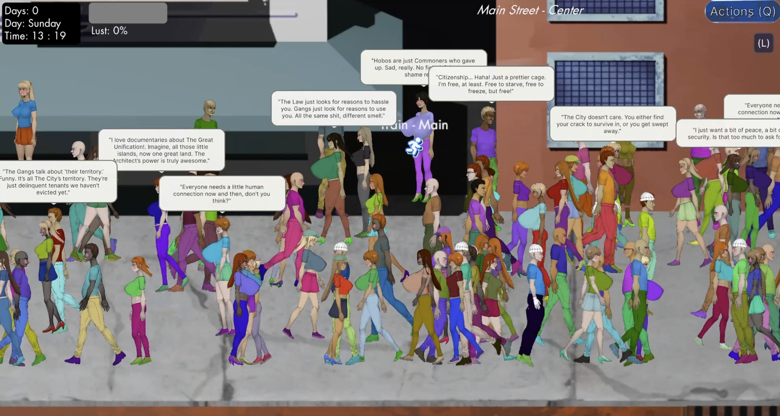 Here’s the spawn system. Parts of the ground are marked as spawnable areas, and every chair, bench, or other object marked as a "spawn object" also has a chance for an NPC to spawn on it. Some locations allow NPCs to walk in and out as well (like Main Street), while each location uses its own spawn calculations, further affected by in-game time settings (more male thugs at night and in dangerous places, hobos in parks/slums, etc.) - completely changing how each location behaves during the day-night cycle. What’s more, Jane can interact with all NPCs and the majority of objects, either for their specific uses or simply as flavor.