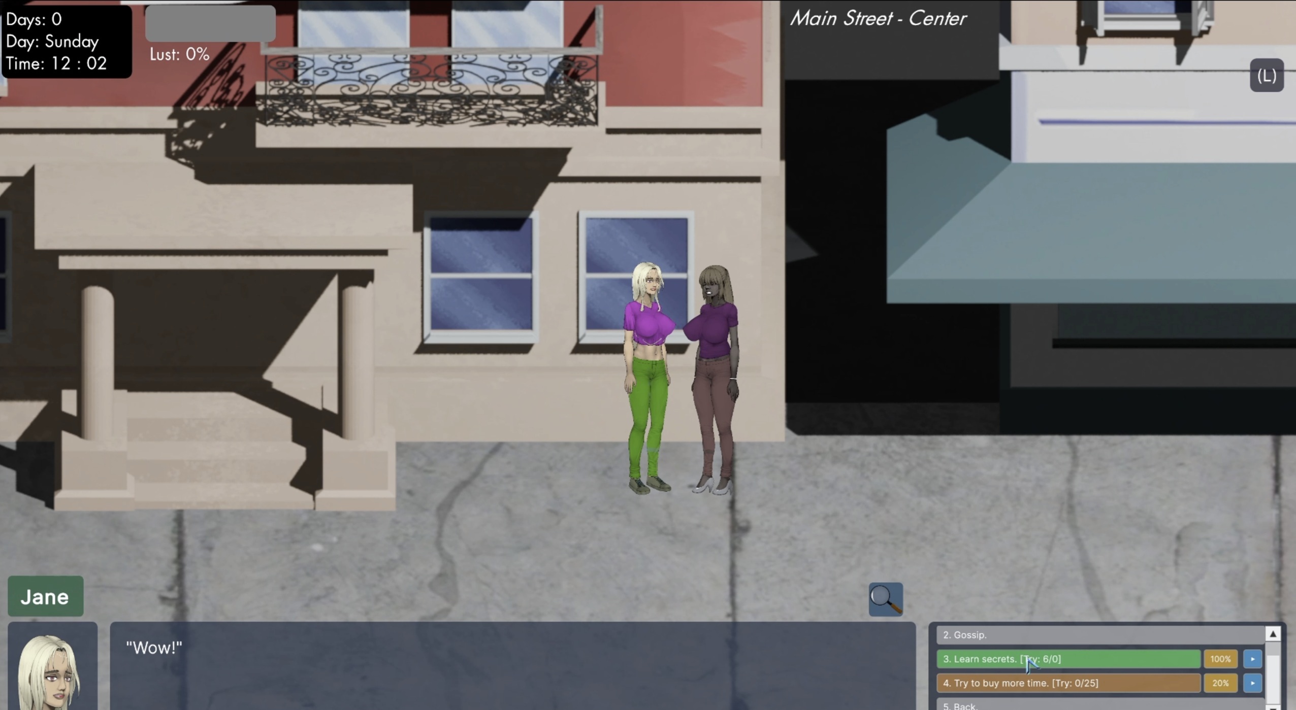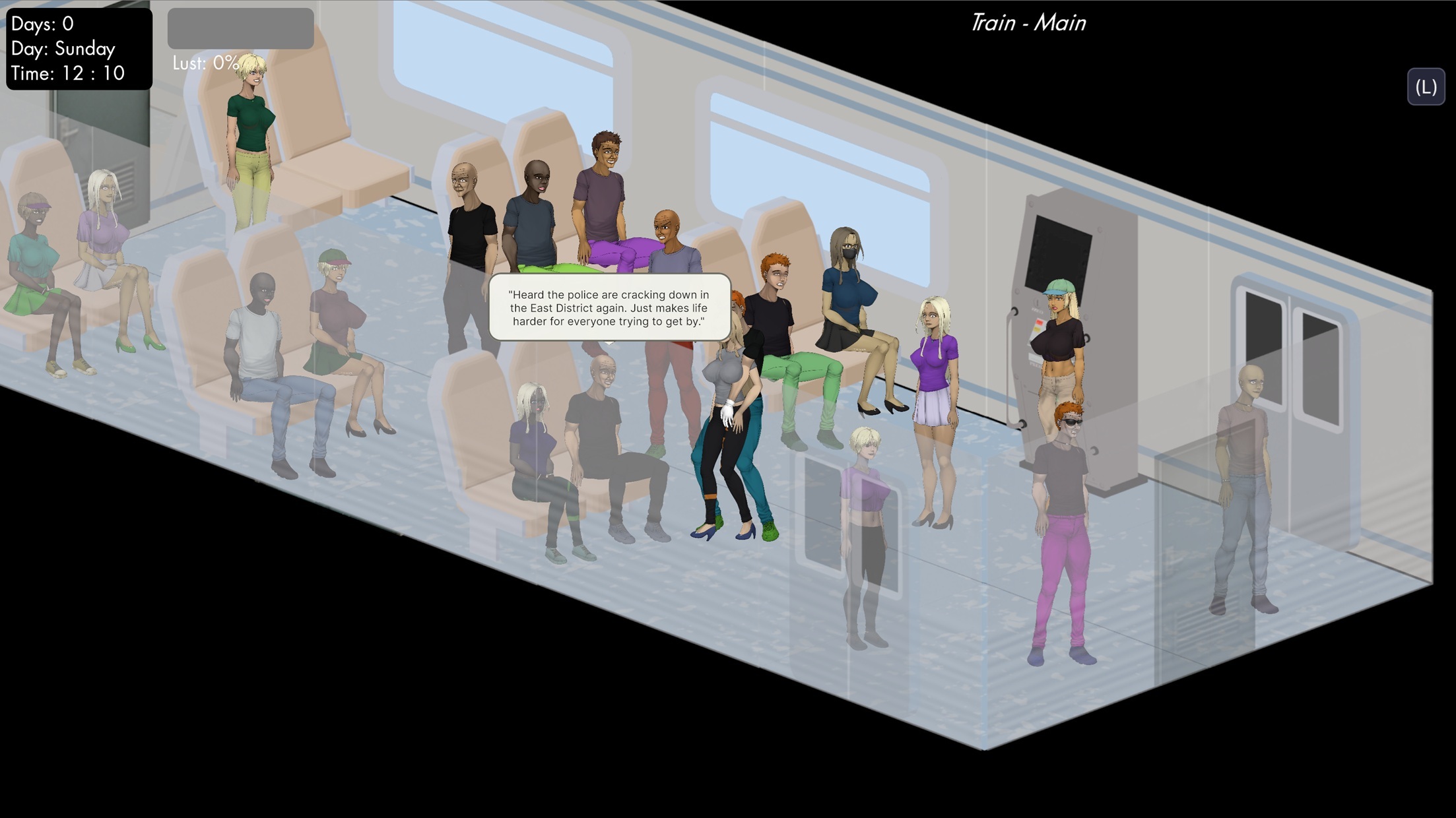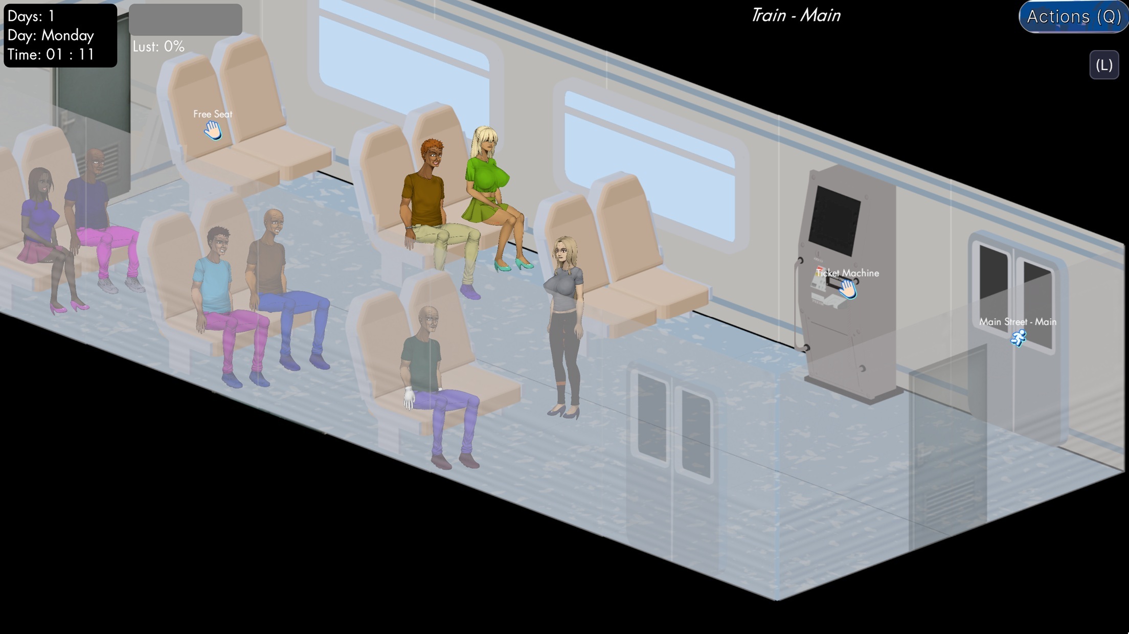 Here’s the spawn system. Parts of the ground are marked as spawnable areas, and every chair, bench, or other object marked as a "spawn object" also has a chance for an NPC to spawn on it. Some locations allow NPCs to walk in and out as well (like Main Street), while each location uses its own spawn calculations, further affected by in-game time settings (more male thugs at night and in dangerous places, hobos in parks/slums, etc.) - completely changing how each location behaves during the day-night cycle. What’s more, Jane can interact with all NPCs and the majority of objects, either for their specific uses or simply as flavor.