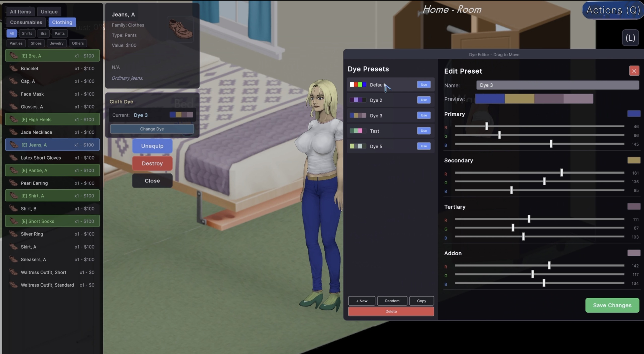 If you buy or find consumable Dye items (which also serve as a money sink), using them will unlock new presets that you can freely edit in your wardrobe (I am not a sadist). These presets can then be applied to any clothing items you want, and they can even be shared, so if you want all clothes to be black, you only need a single Dye. Editing a Dye will also update all clothes that use it. And yes, they can be used on unique outfits as well, like the nurse or waitress outfits.