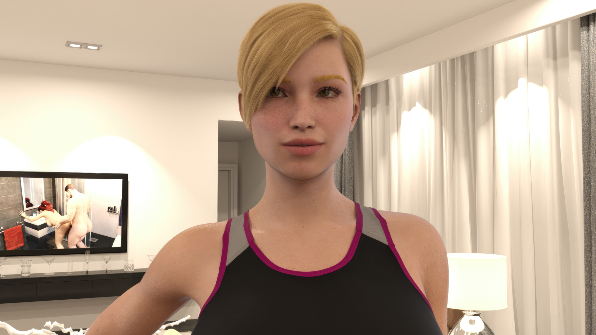 This was a small detail that we made sure to have in this part of the development, as we wanted both Luna and Veronika to appear parading in lingerie in the background, as we had not explored this outfit on the characters in this context previously.