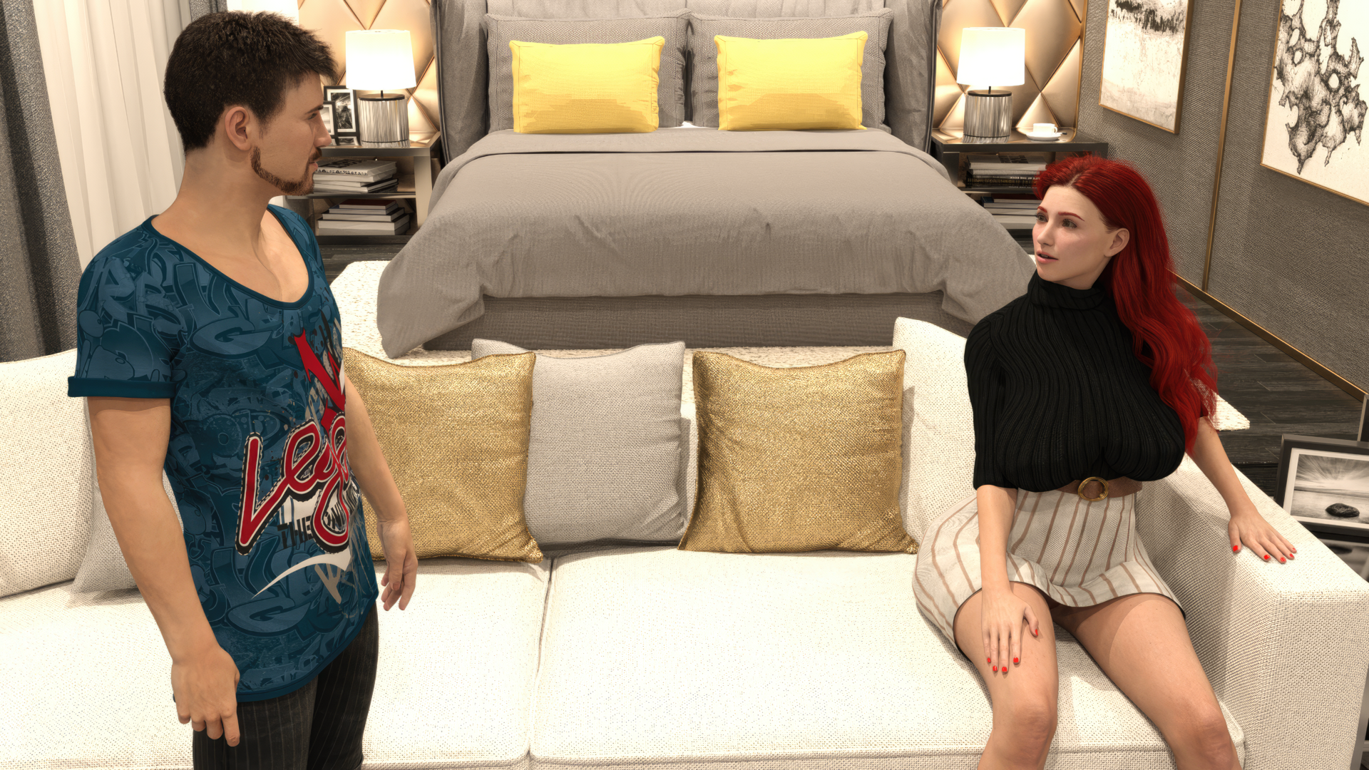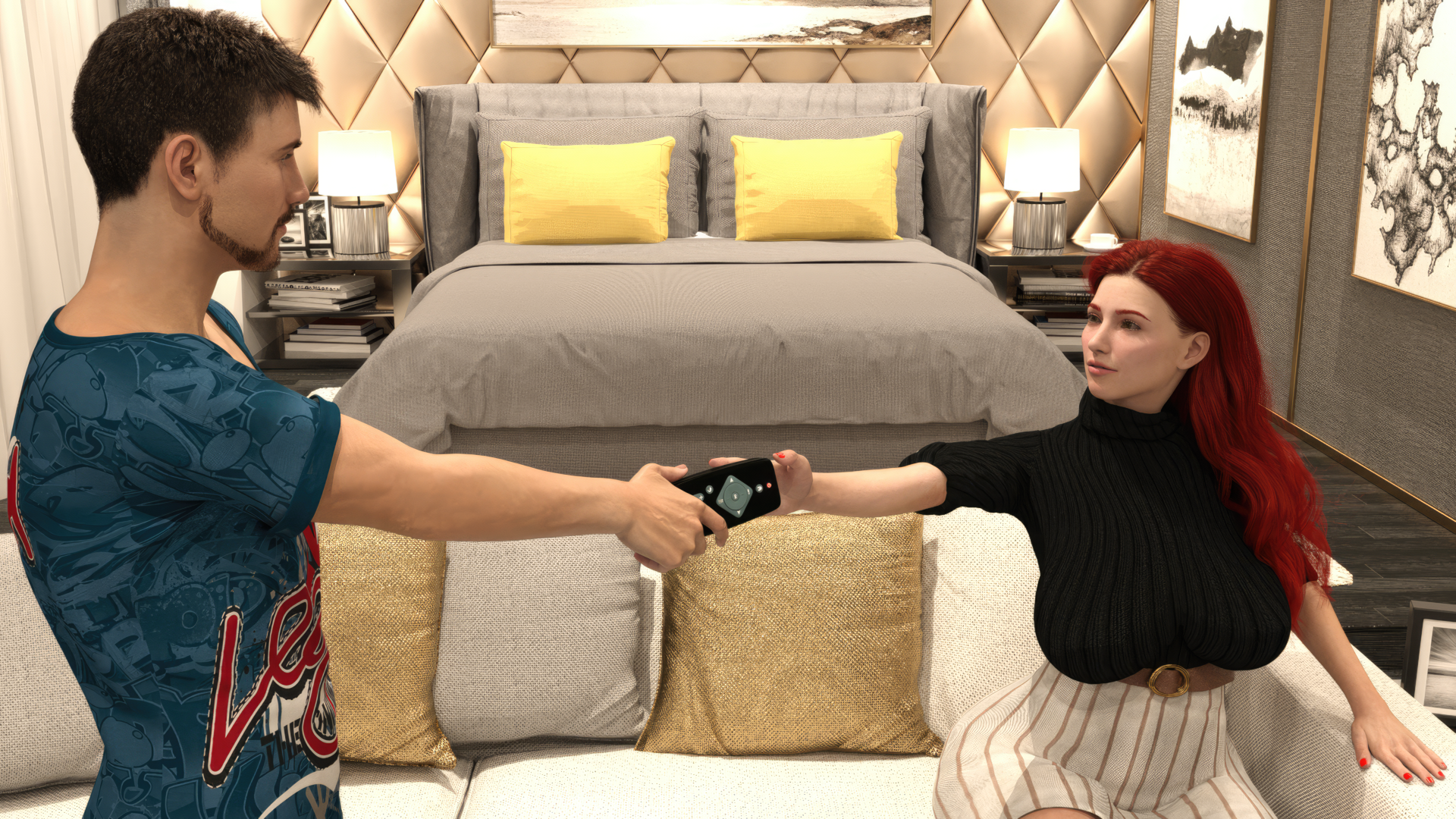 She has a TV remote in her hand and is talking to you. What will be the context that will unfold for her to start a sex scene with the MC? For now, we'll keep this a surprise.