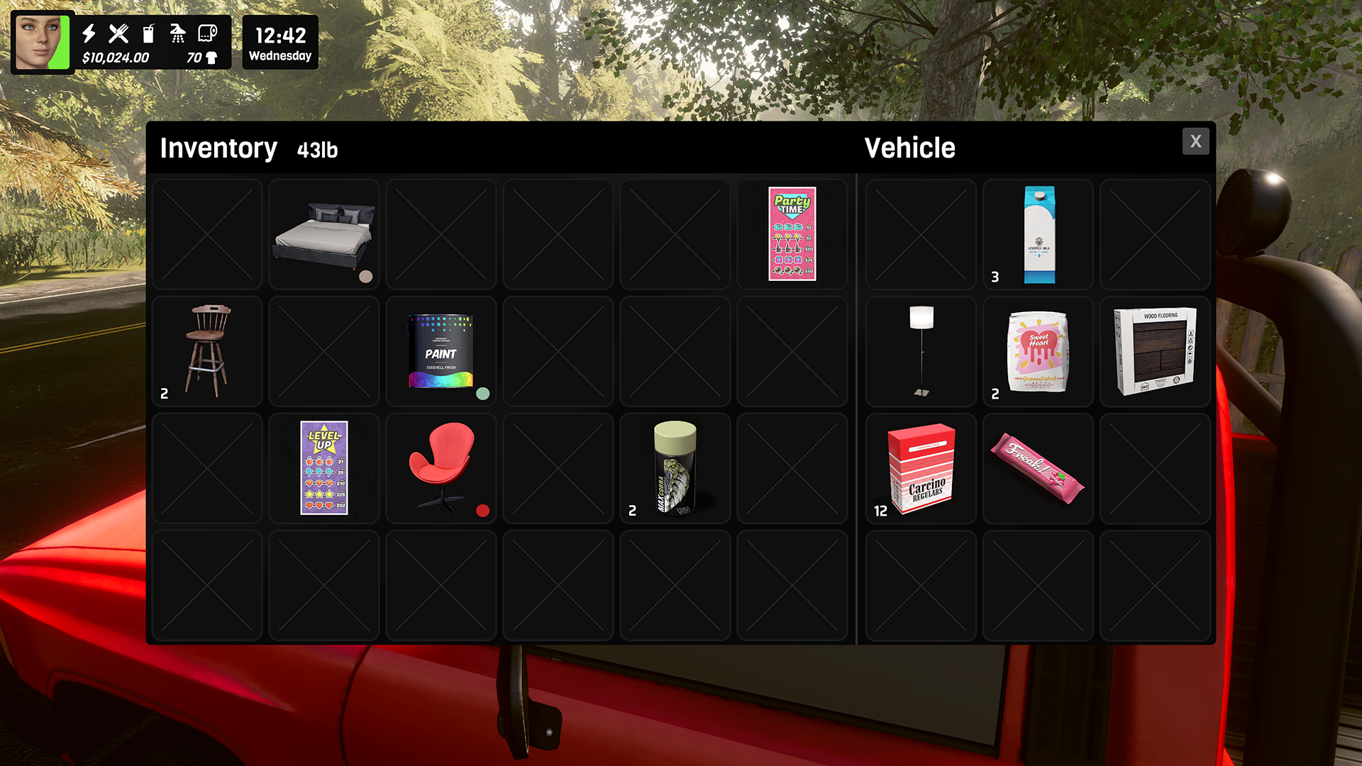 A vehicle inventory system has been added, allowing item transfers between your personal inventory and vehicle storage for improved organization and transport.