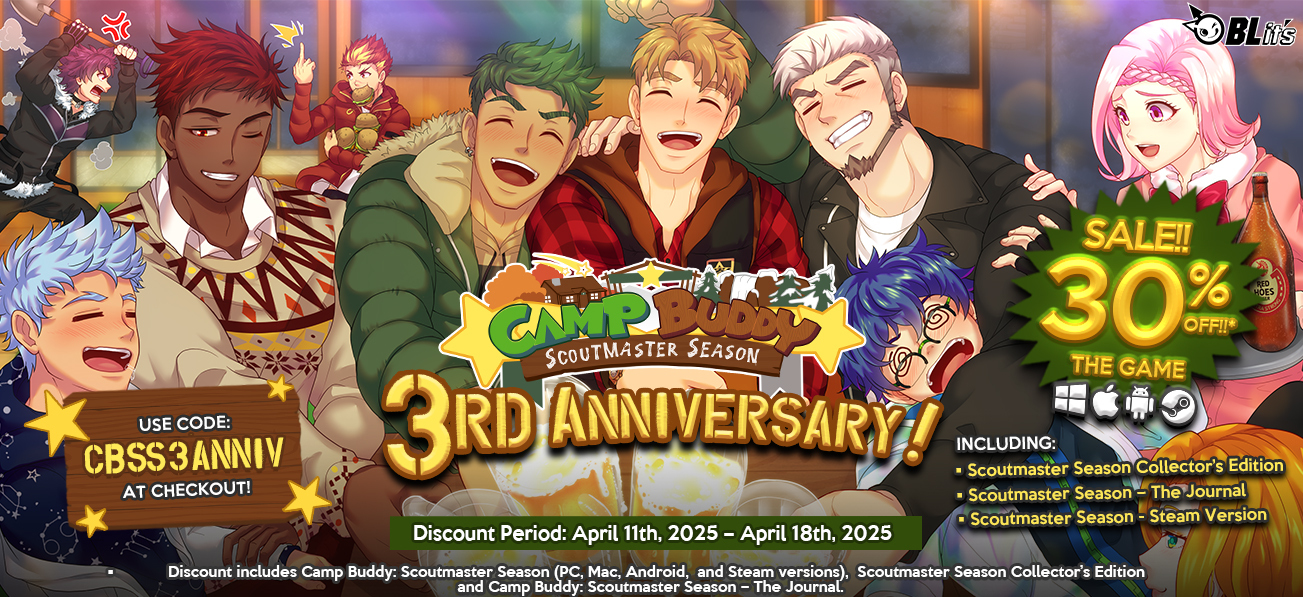 Hey, buddies! It’s Scoutmaster Season’s Third Anniversary Celebration Month, and like we previewed last week, we’re here with lots of new and exciting content celebrating the third birthday of BLits’ second-ever game and sequel to Camp Buddy! Please read the full post for details, as it contains instructions for all fans of Camp Buddy, Scoutmaster Season and BLits!
