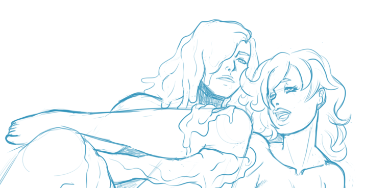 After Goblin thieves in green and Kobold mages in red, I wanted to have the Slimes to be blue-colored and to look more like tank. I also asked the artist, Pululon, for a small emo vibe and a more mature look, especially for the dude. References images for humanoid slimes were... rather juvenile, to say the least. Giving them leather, "gladiator-like" clothes was his idea and I totally dig it.