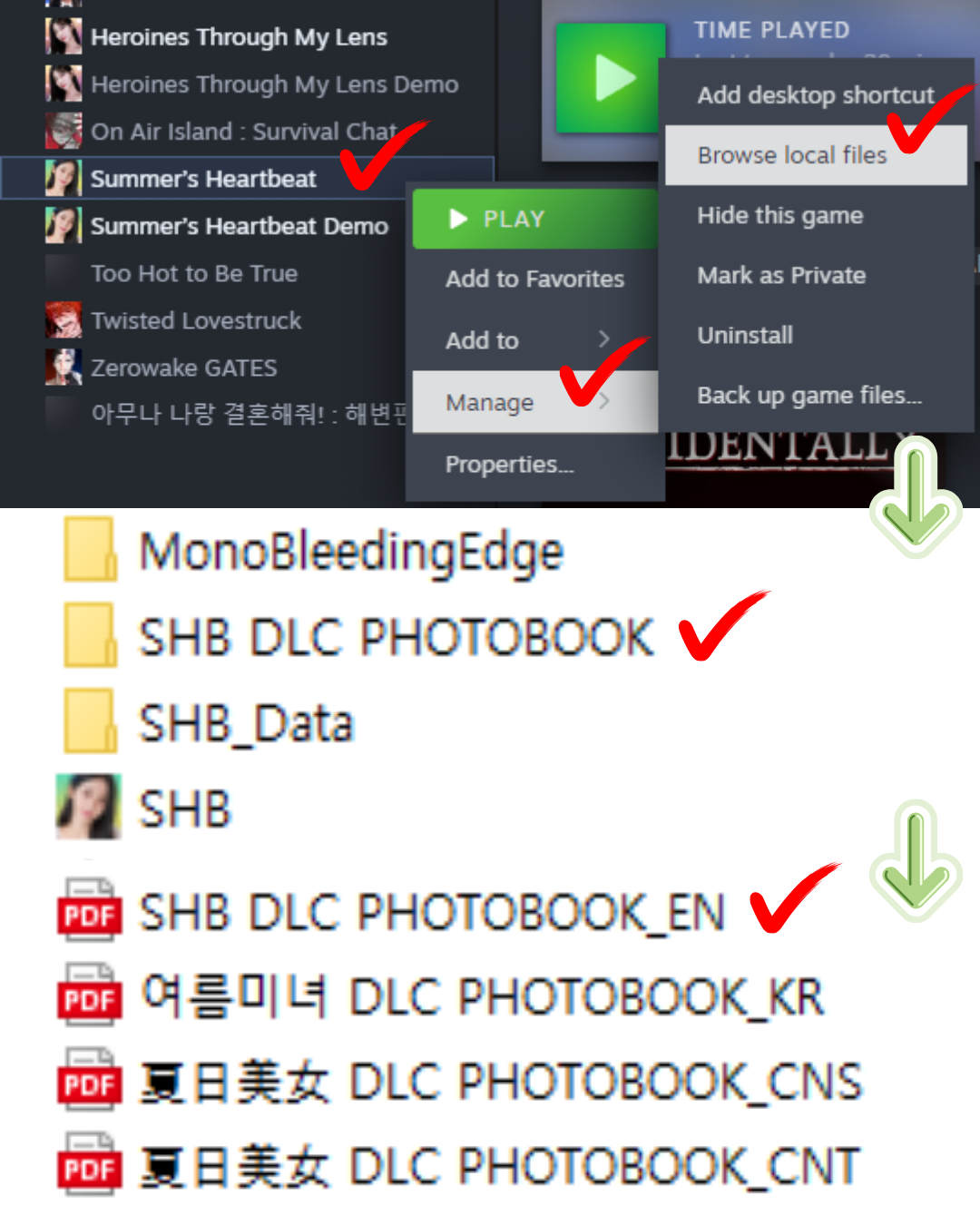📖 After purchasing the DLC, you can find your Photobook by going to your Steam Library, right click on the game, and click \[Manage] > \[Browse local files] > choose the PDF file as shown in the image below!