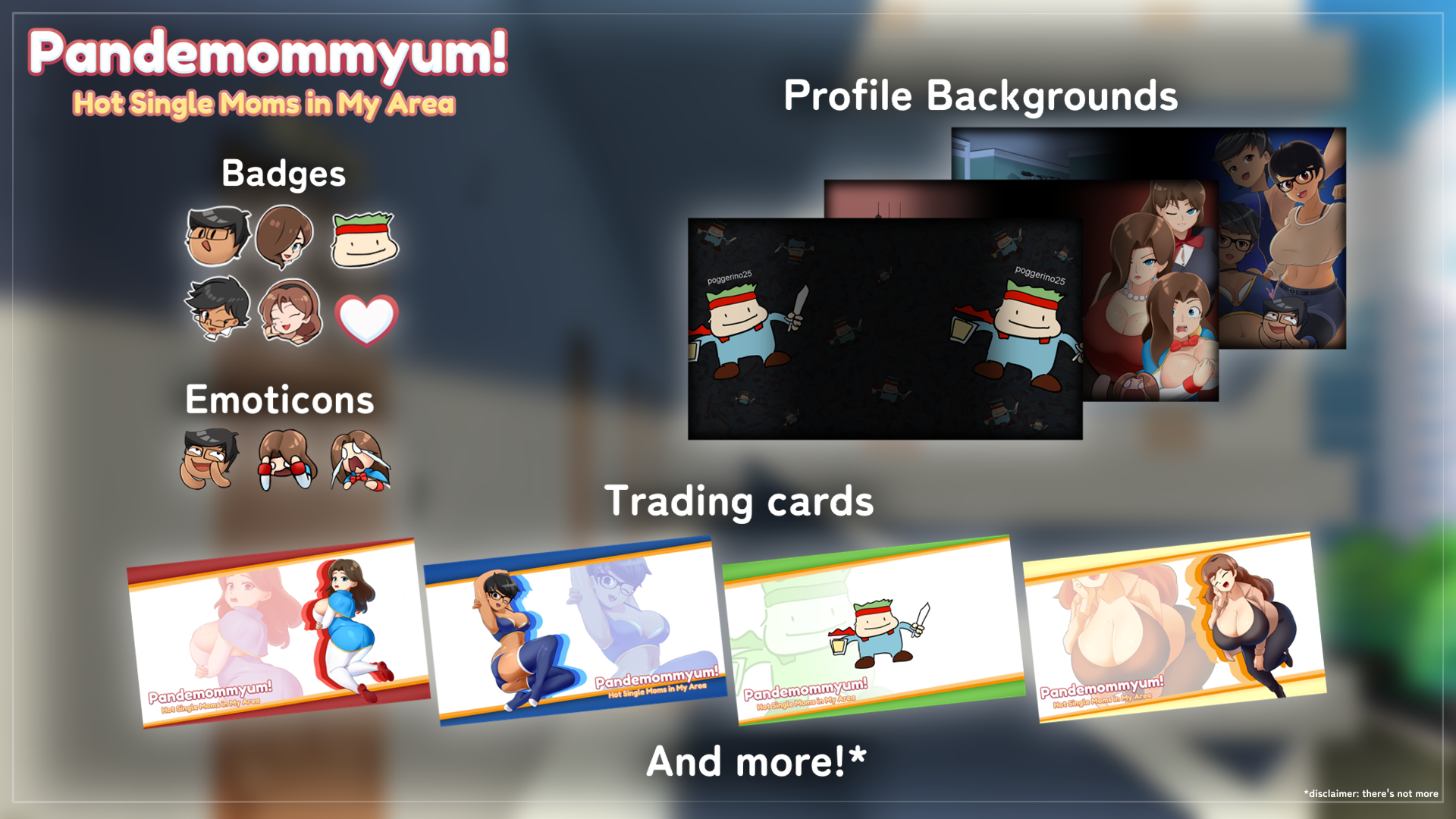 Trading cards, profile backgrounds, emotes and more have been added to AquapauloGames's "Pandemommyum! Hot Single Moms in My Area"!