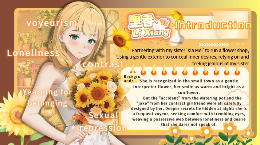 • Natsumi (Florist Partner): Control freak + sadistic queen. Jealous of her little sister Rika, she both teases and dominates you.