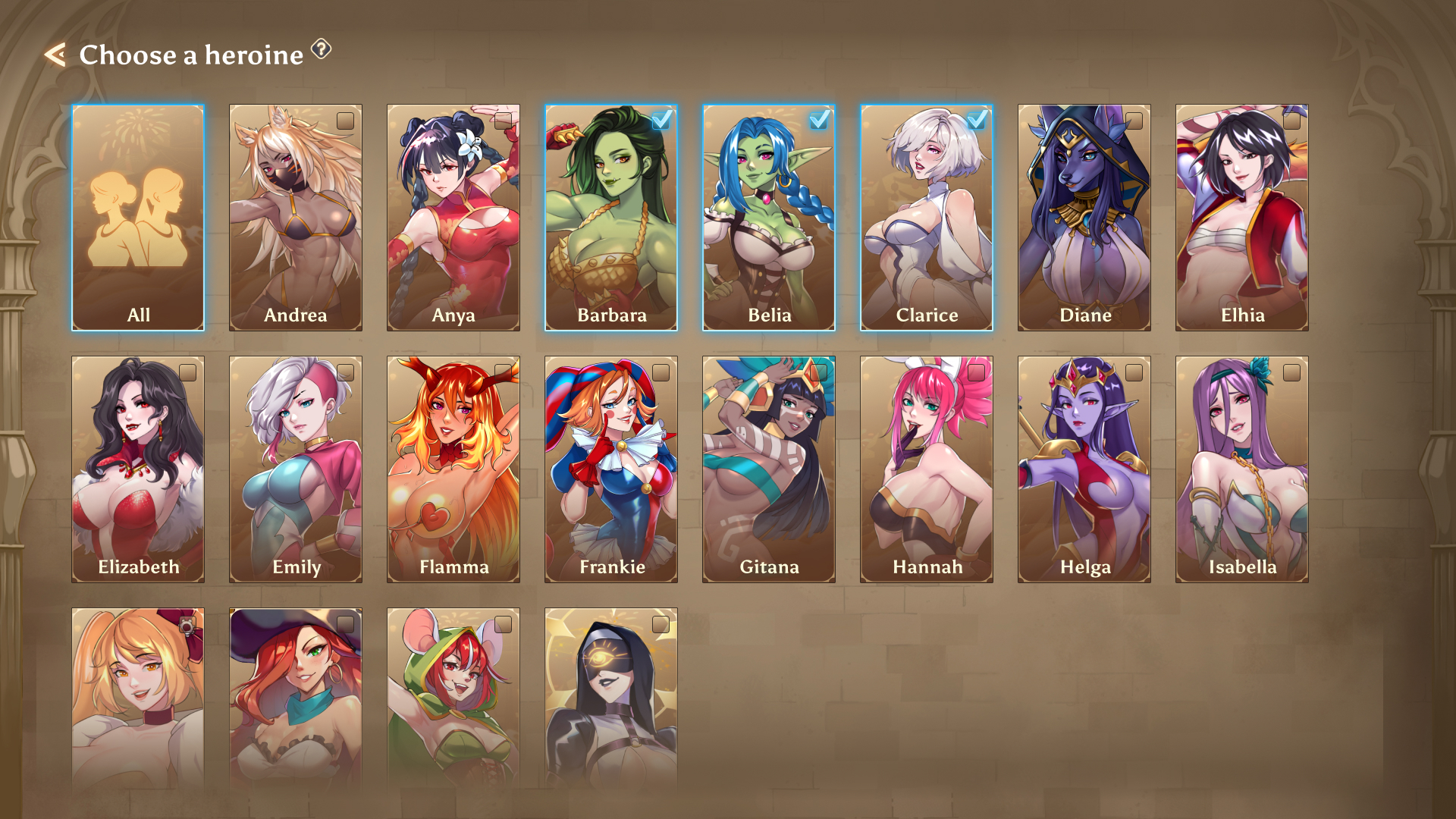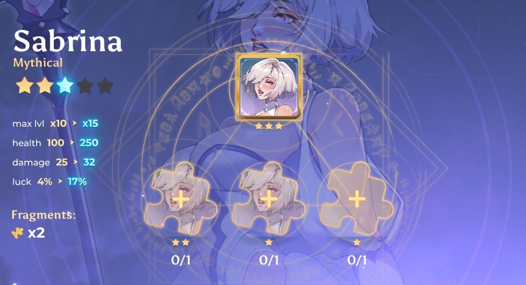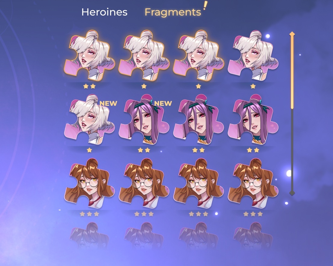 Finally, we have some early concepts for what is called the merge system. Every heroine in the game can be upgraded by combining her shards. This process adds one more star to heroine rating which in return allows her to be upgraded to higher levels.