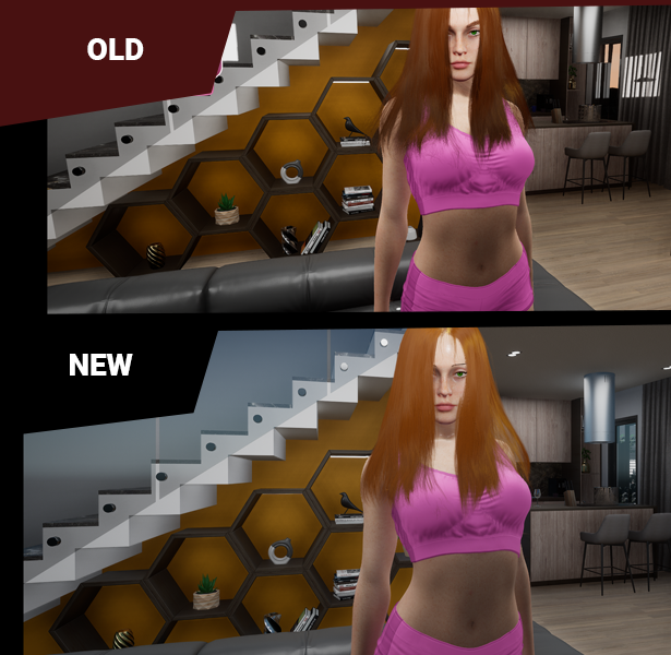 If you played the beta, it won't be a surprise, but if you didn't you will see a huge difference compared to before! The light changes not only improve the look but also help run the game better (which is going to allow me to do a threesome and such a thing very shortly! it also solved some problems I had with the hair particle.
