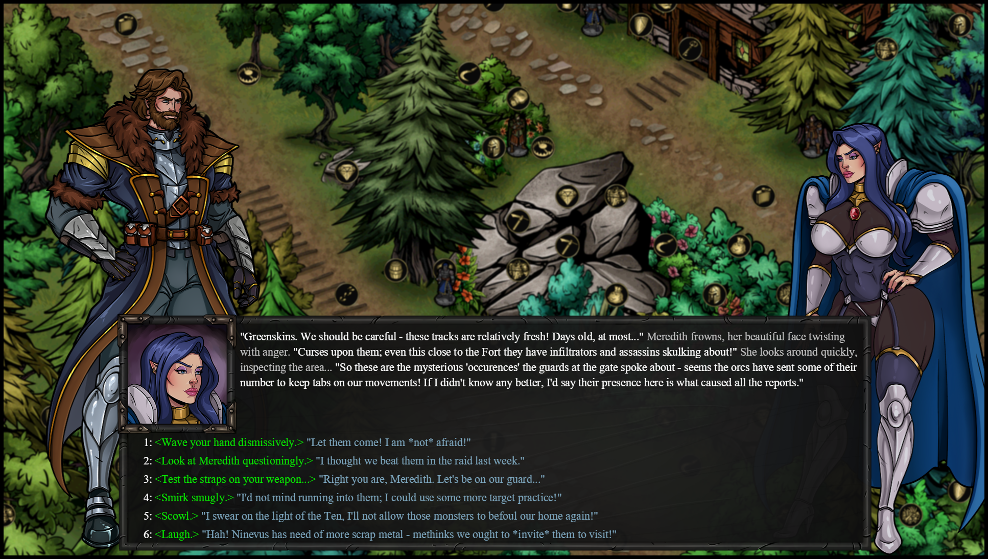 You are Captain Hale, a famous war-hero and adventurer! Joining you is Meredith, your loyal half-elven paladin companion. Together you defend the frontier from lustful bandits and horny monsters...